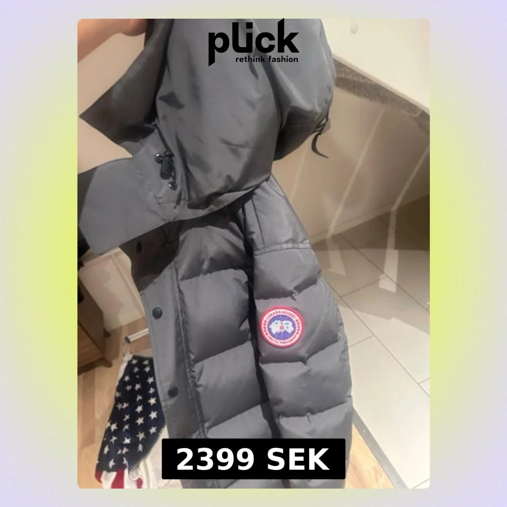 Säljer en grå dunjacka från Canada Goose med huva och klassisk logga på ärmen. Jackan har dragkedja och tryckknappar framtill, samt justerbar huva med snörning. Perfekt för kalla vinterdagar och har en clean, modern look.