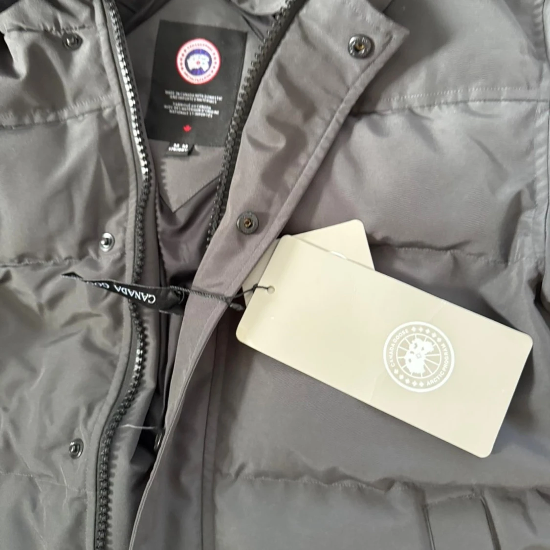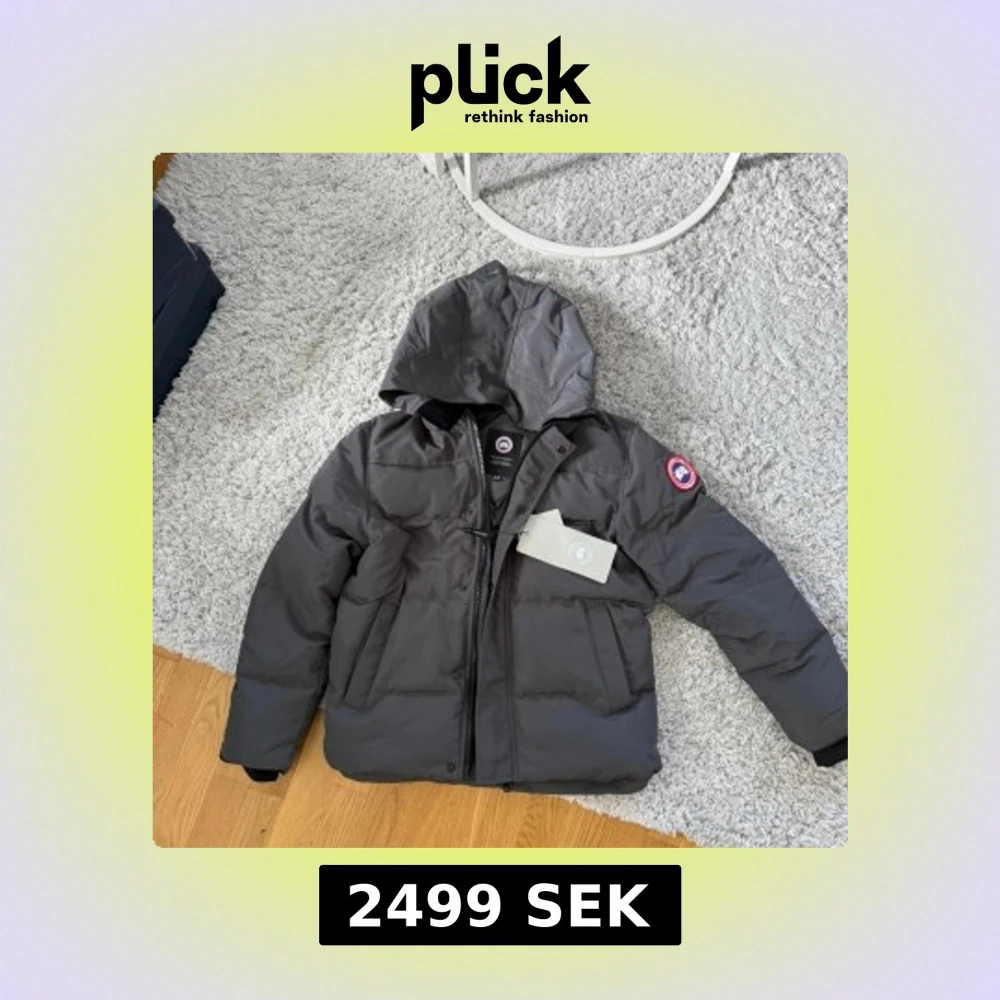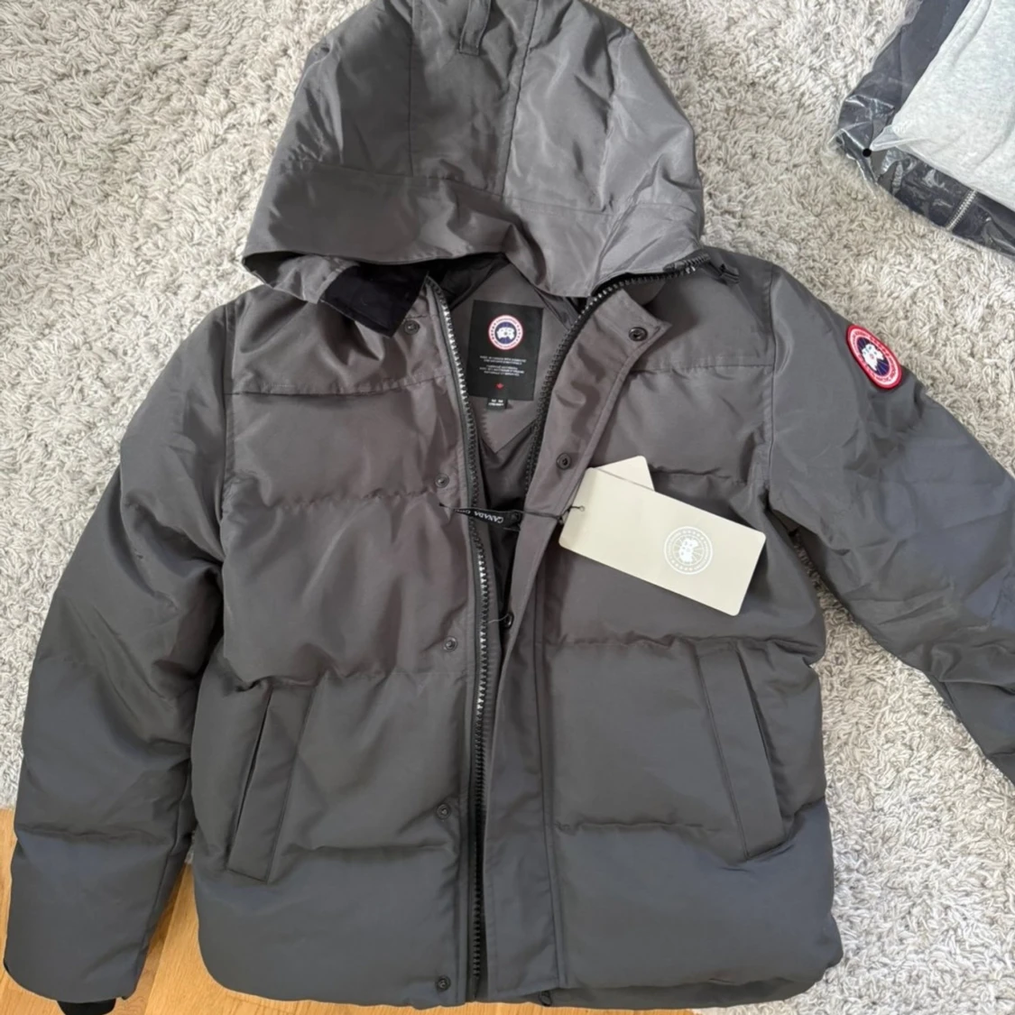 Säljer en grå dunjacka från Canada Goose med huva och klassisk logga på ärmen. Jackan har dragkedja, stora fickor och en clean, puffig look. Perfekt för kalla dagar och riktigt snygg till streetwear-stilen.