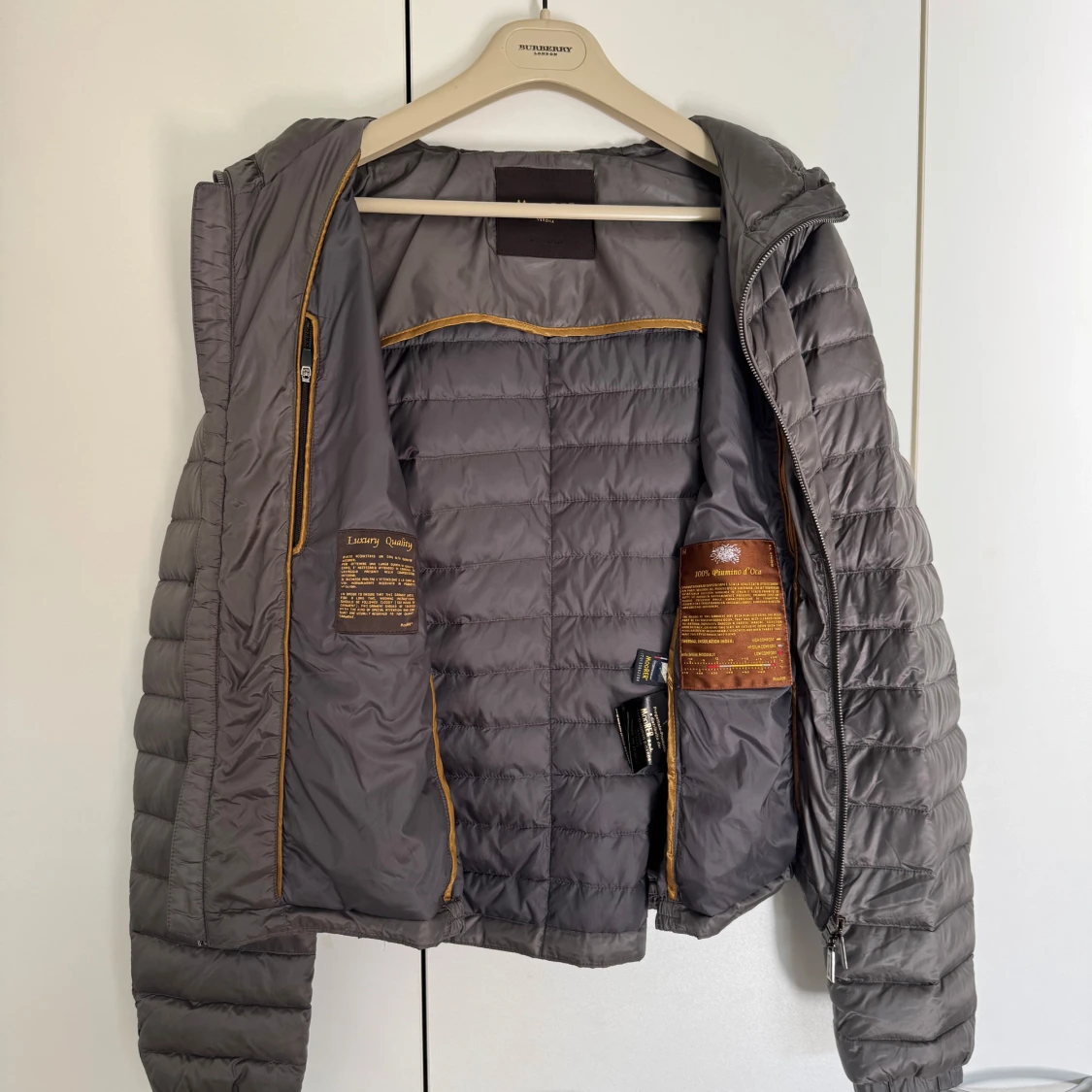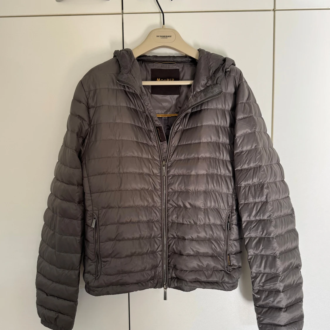 Snygg grå dunjacka från MooRER med huva och quiltad design. Jackan har dragkedja framtill och är fylld med 100% gåsdun för maximal värme. Perfekt för dig som vill ha en stilren look och samtidigt hålla dig varm under kyliga dagar. Har en liten defekt vid ärmen, men den syns inte vid användning
