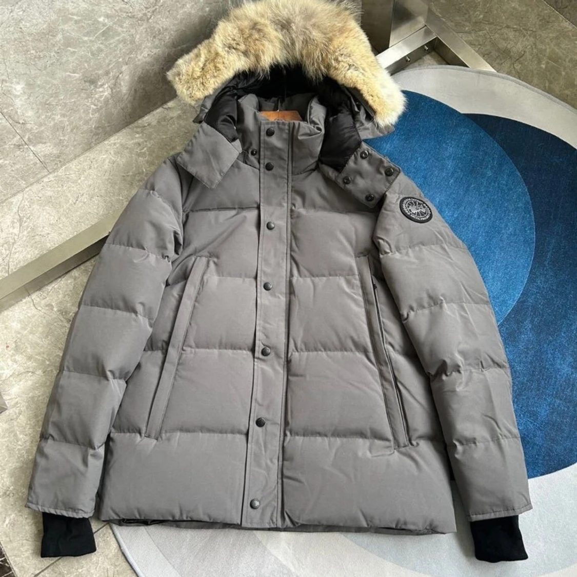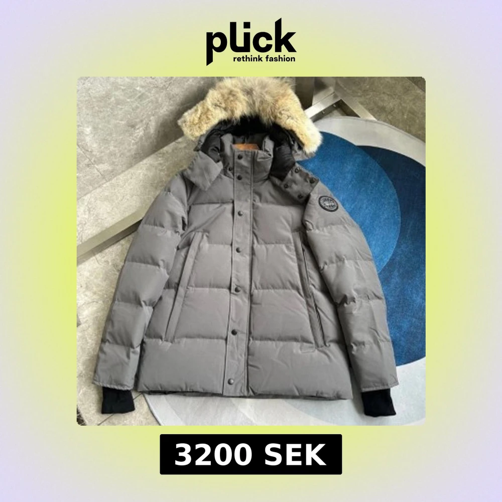 Säljer en grå dunjacka från Canada Goose med stor huva och fuskpäls. Jackan har svarta muddar, raka fickor och patch-logga på ärmen. Perfekt för kalla dagar och har en klassisk, stilren look.