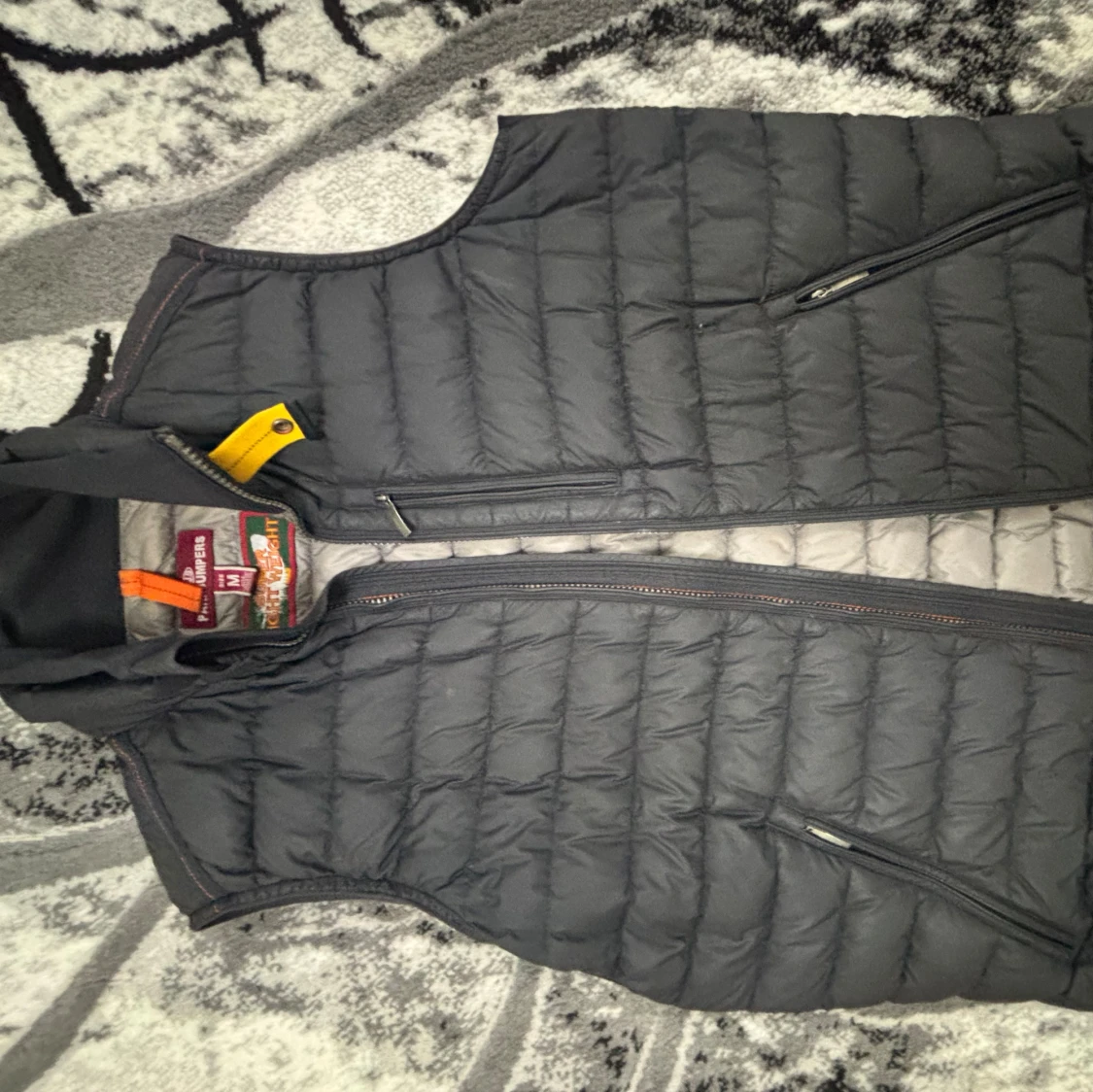 Snygg quiltad dunväst från Parajumpers i grått med svarta detaljer. Västen har dragkedja framtill, två sidofickor med dragkedja och en gul detalj vid kragen. Perfekt för lager-på-lager och stilren look.