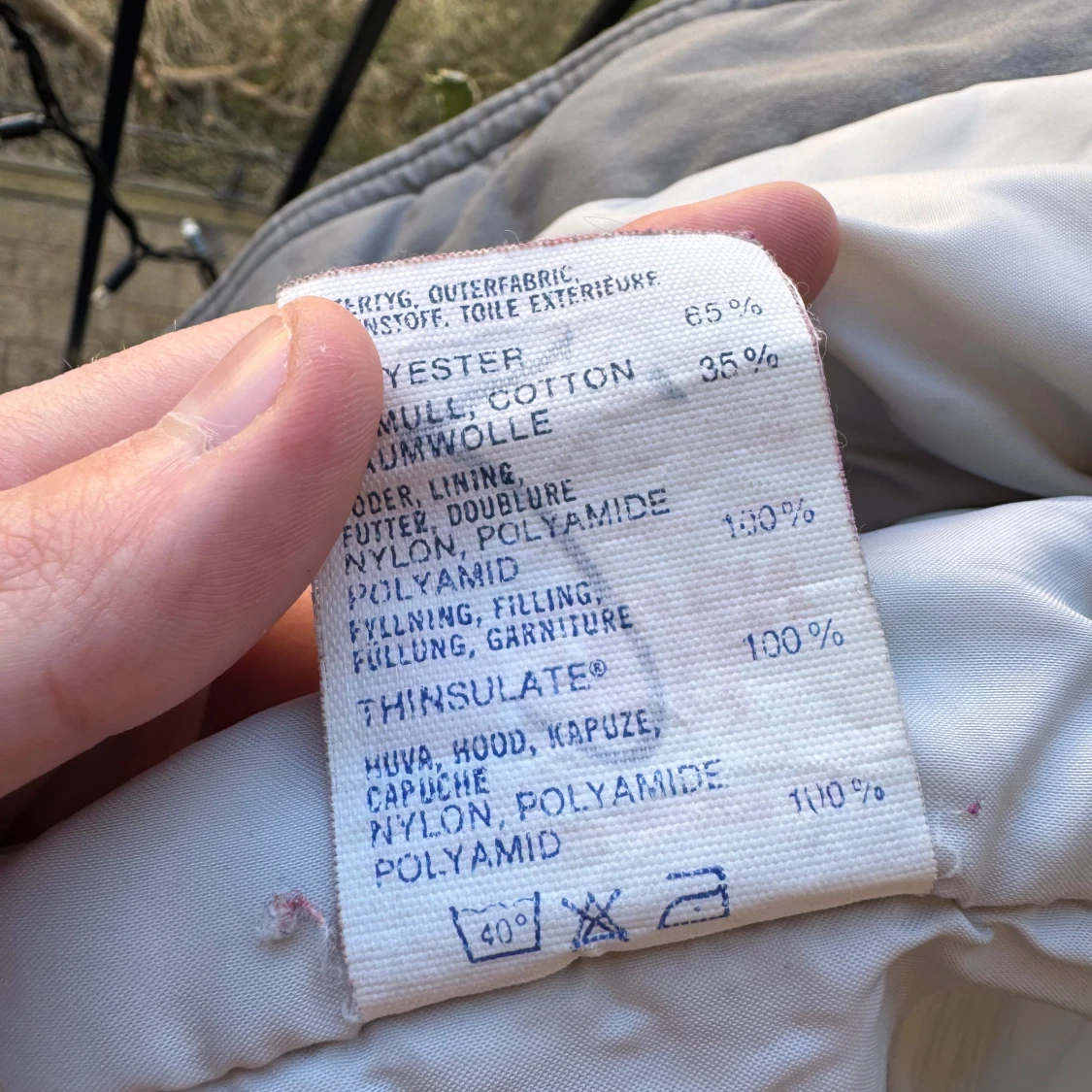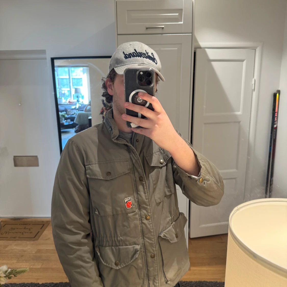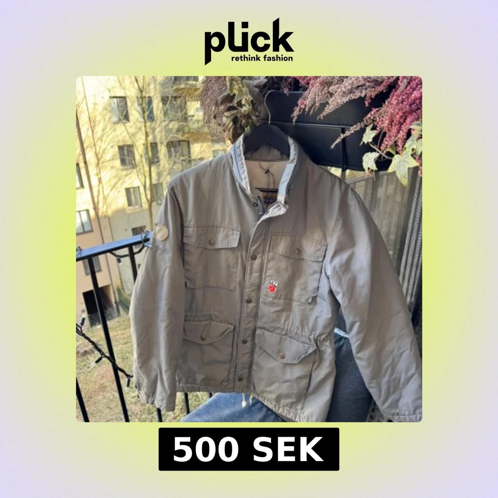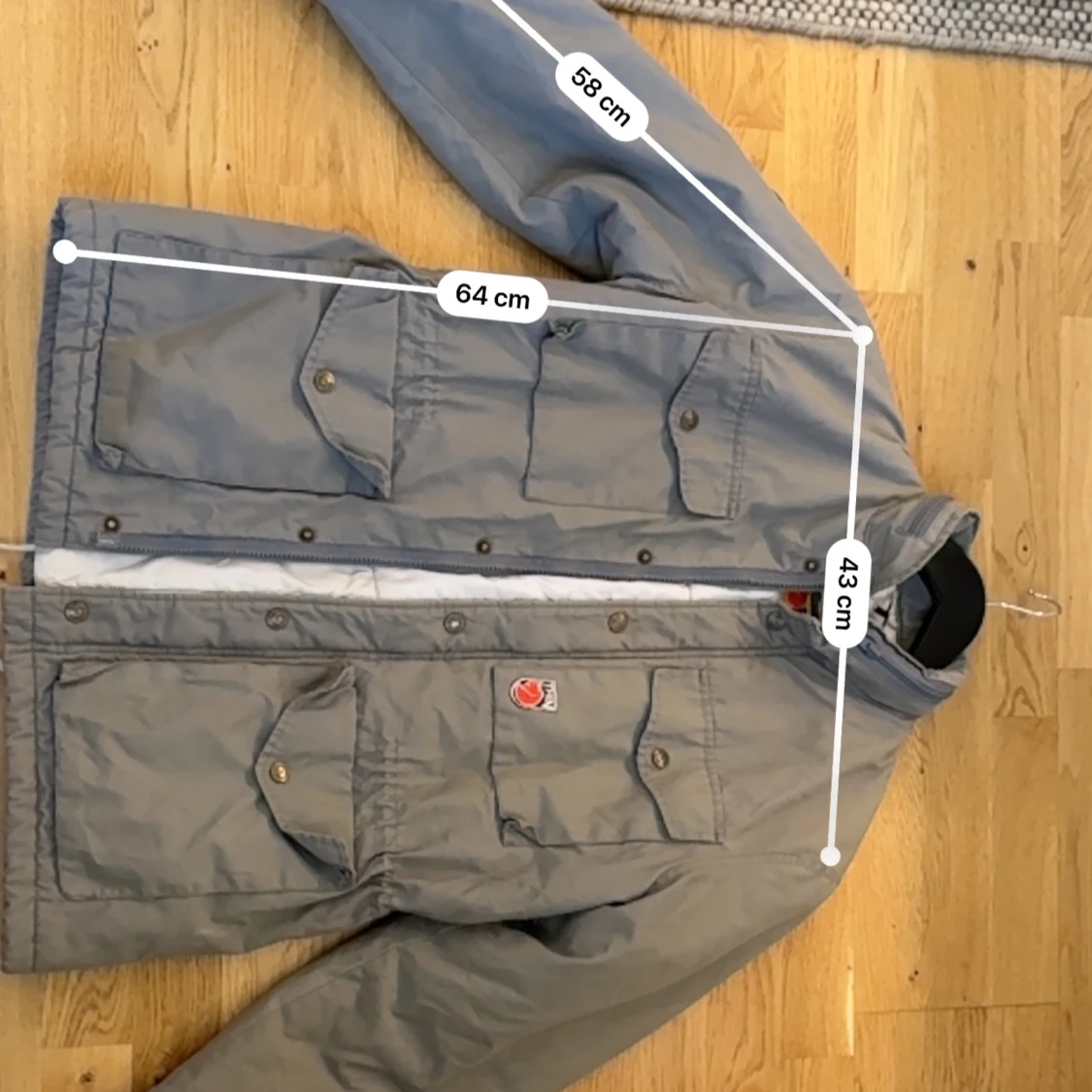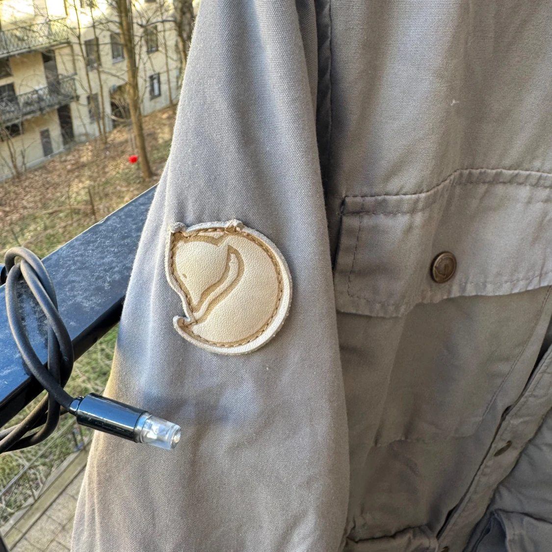 Säljer en grå jacka från Fjällräven med fyra stora fickor framtill och broderad logga på ärmen. Jackan har hög krage, dragkedja och knappar. Materialet är en blandning av polyester och bomull, med foder i nylon.