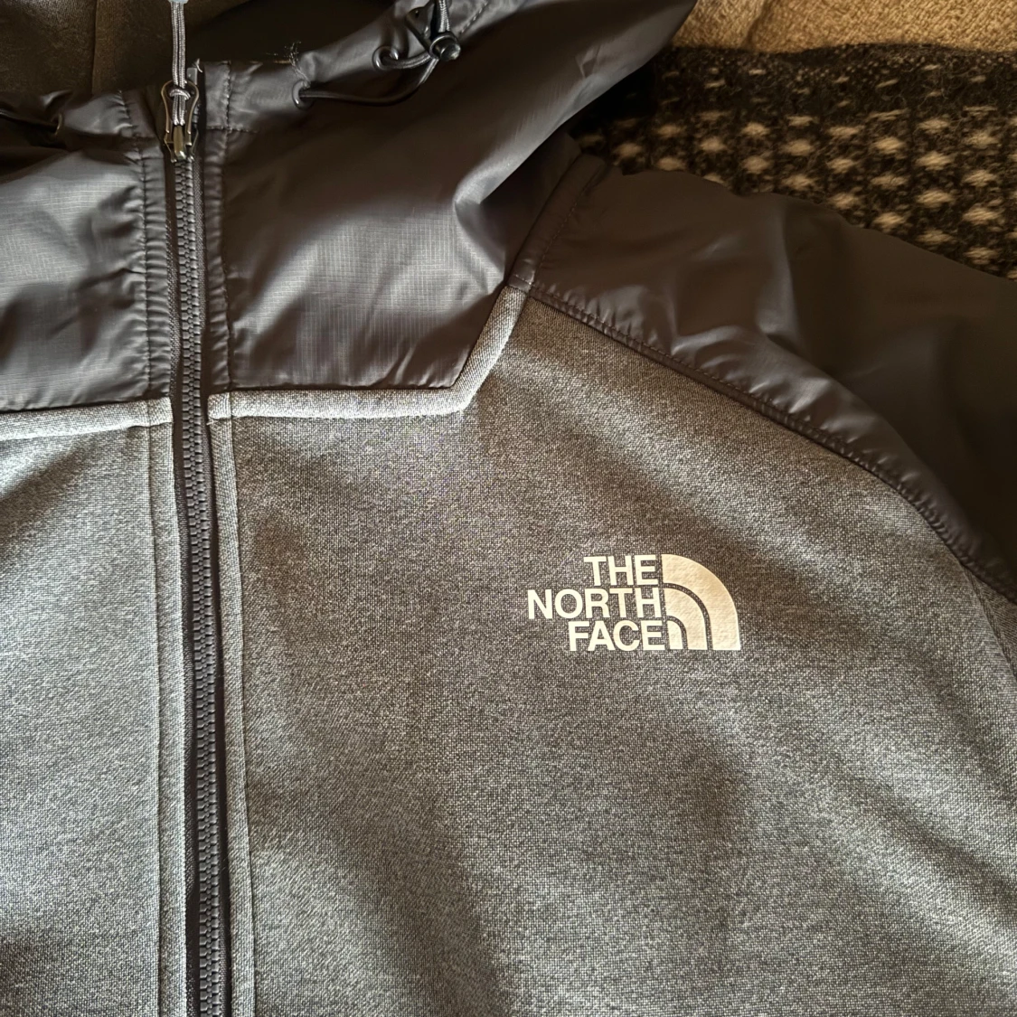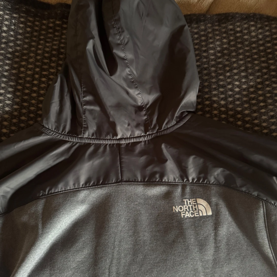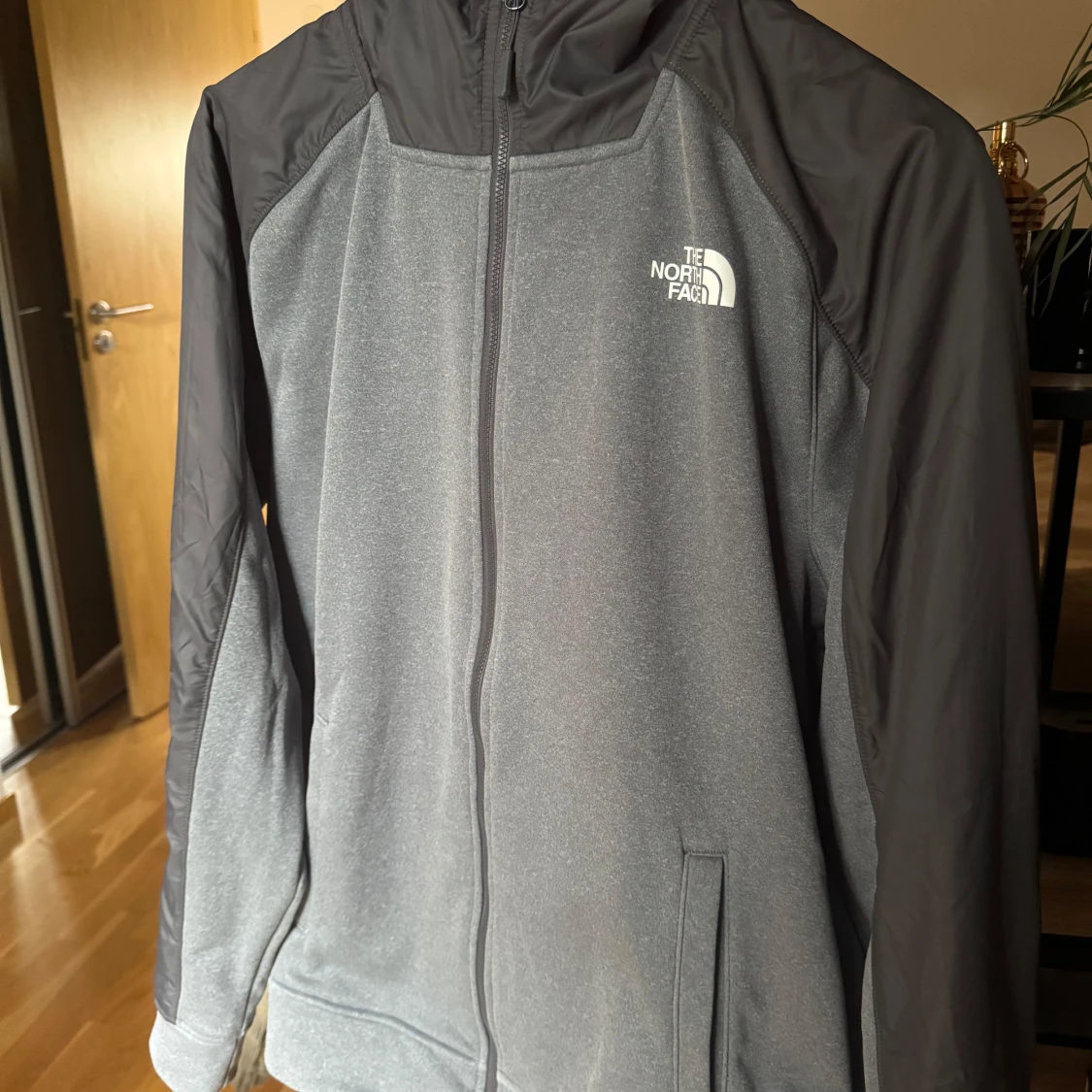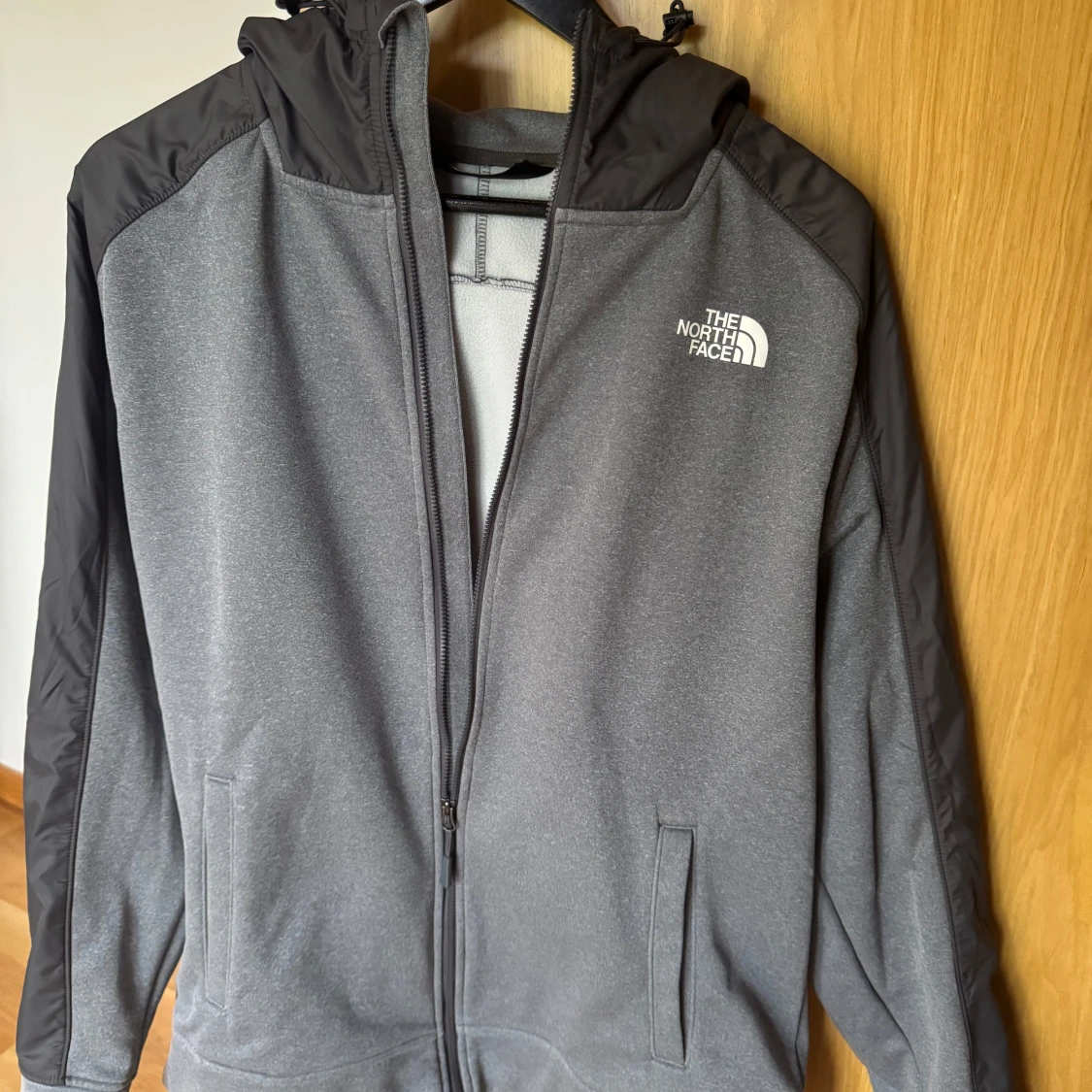 Riktigt schysst grå fleece-jacka från The North Face med mörkgrå huva och axelparti. Jackan har dragkedja hela vägen, två fickor och en stilren design. Perfekt till både träningstillfällen, utomhus men även perfekt till vardagliga outfits. Insidan är full fleece, skydar mycket väl mot vind och håller sig varm samtidigt som den är väldigt lätt och tunn. Den är använd bara 1-2 gånger, alltså nästan nyskick. Ordinarie pris 1300