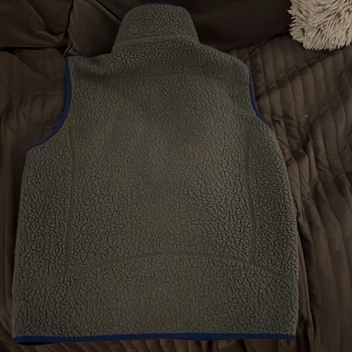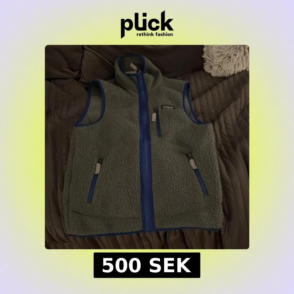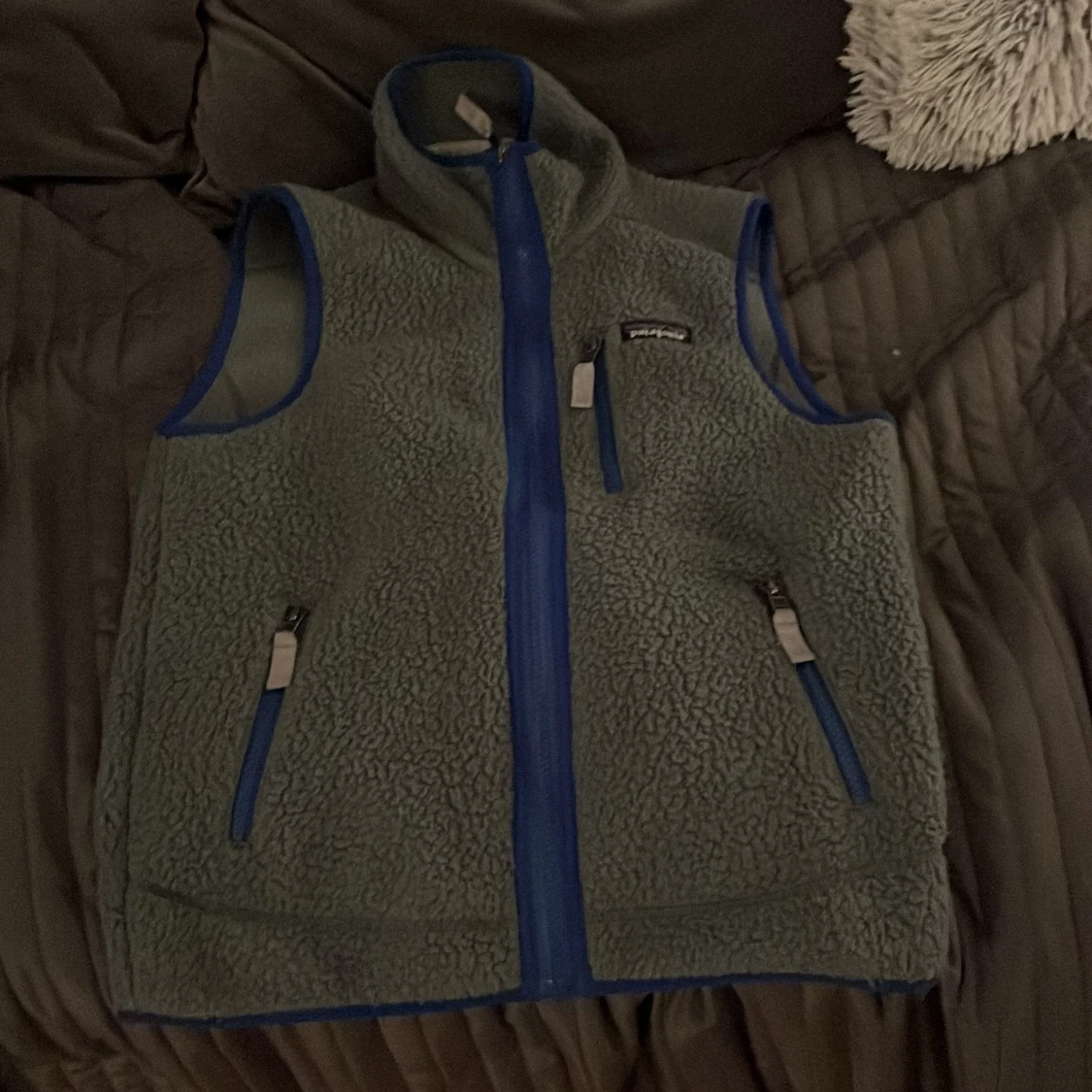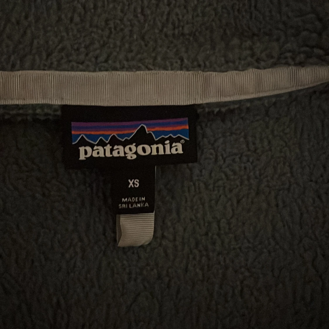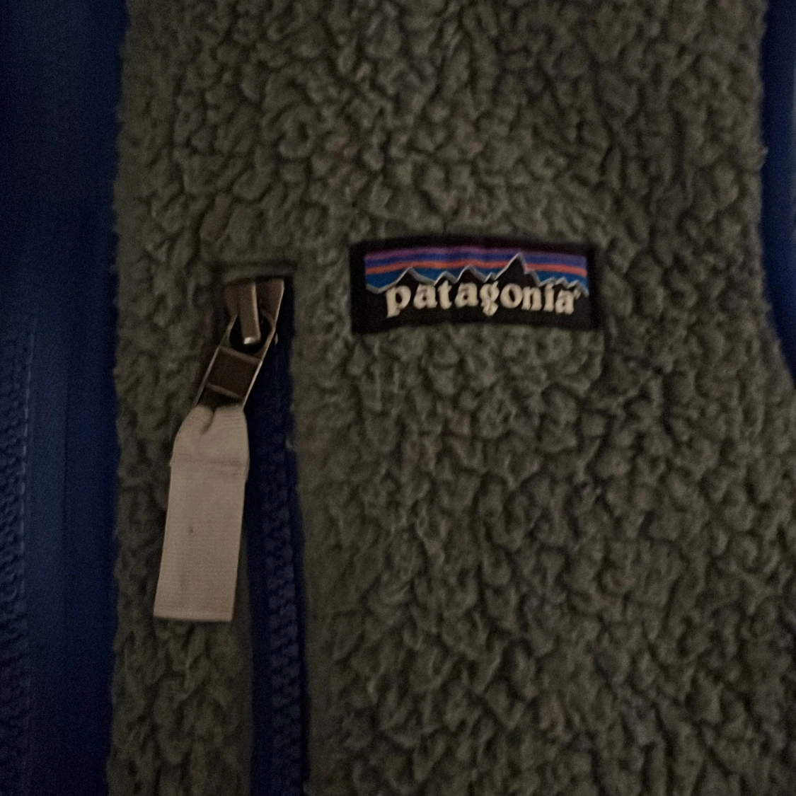 grå fleeceväst från Patagonia i storlek XS. Västen har blå detaljer, hög krage och tre fickor med dragkedja. Perfekt för lager-på-lager och outdoor-vibes. Klassisk Patagonia-logga på bröstet och mjuk teddystruktur.