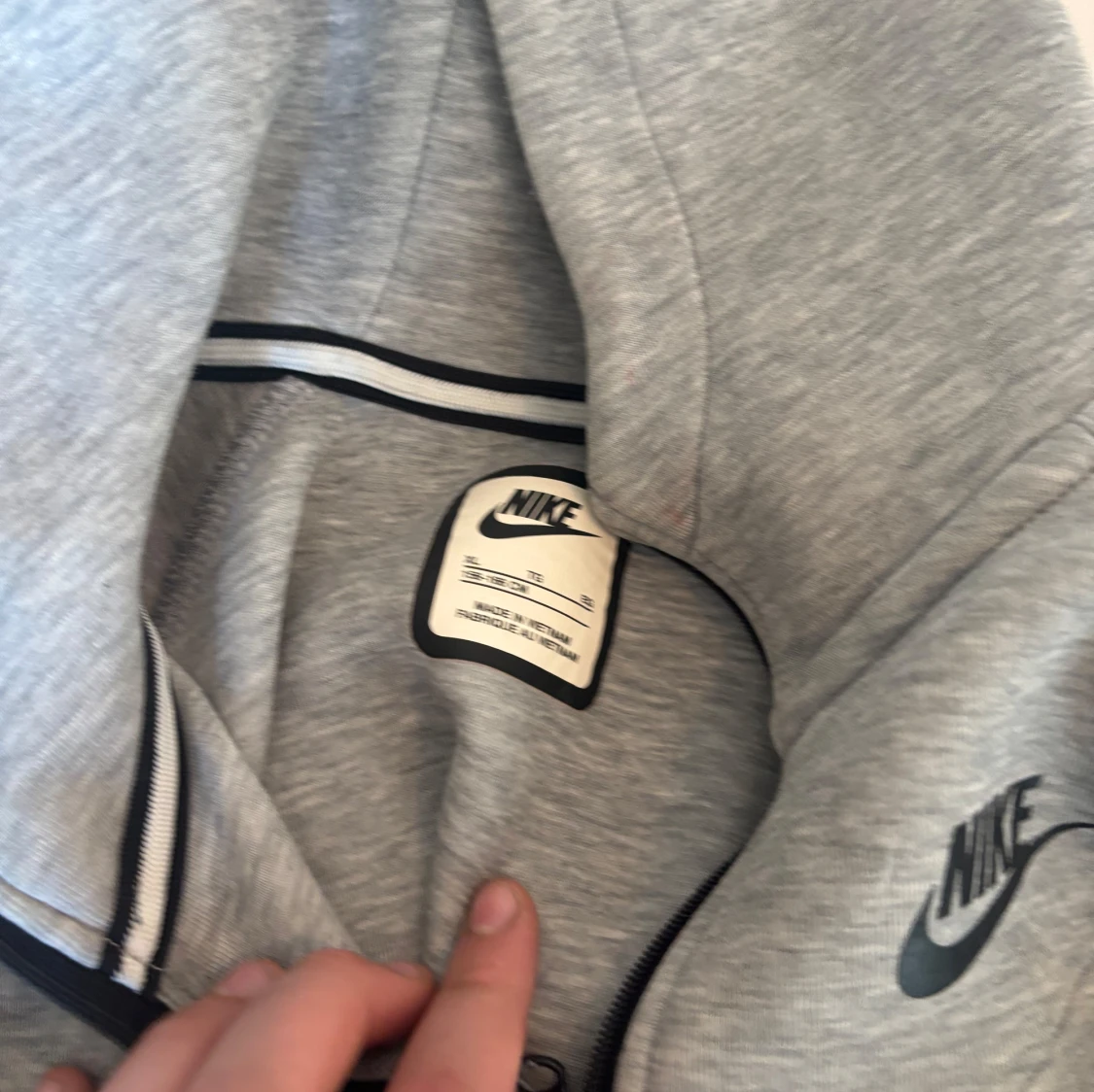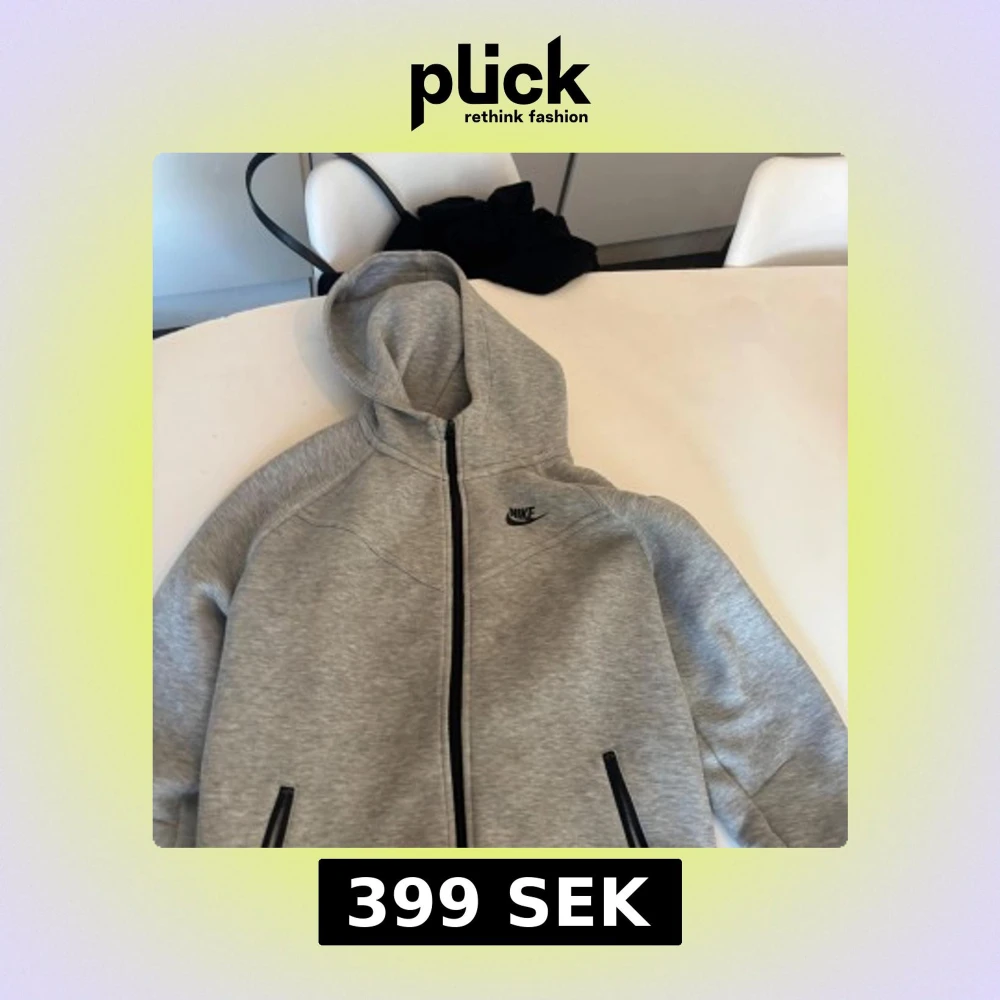 Säljer en grå hoodie från Nike med dragkedja och huva. Jackan har en enkel och stilren design med Nike-logga på bröstet. Perfekt för en avslappnad stil.