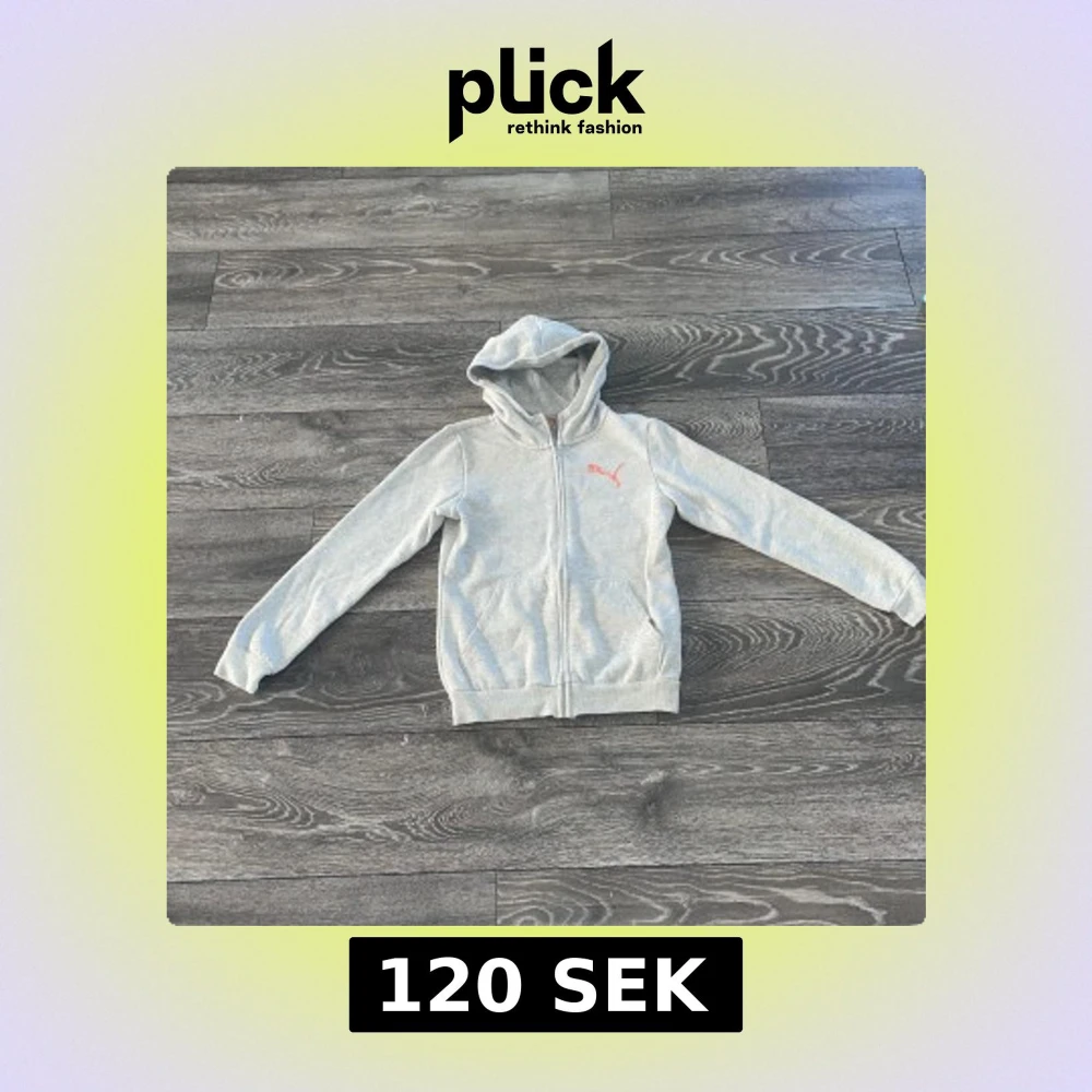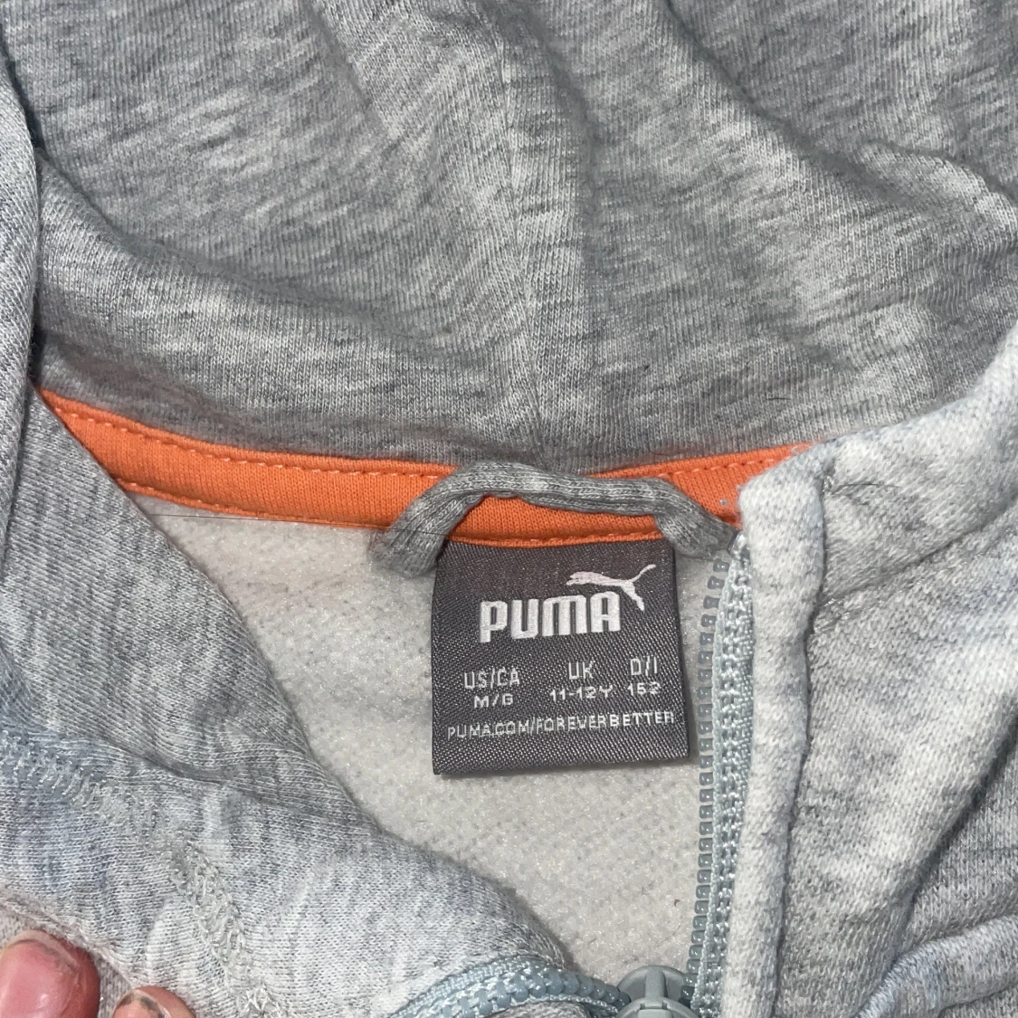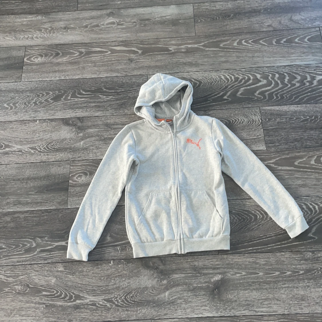 Grå hoodiejacka från Puma med dragkedja framtill och orange Puma-logga på bröstet. Jackan har huva, två fickor och ribbade muddar vid ärmslut och nederkant. Perfekt för chill dagar eller när du vill ha en sportig look.