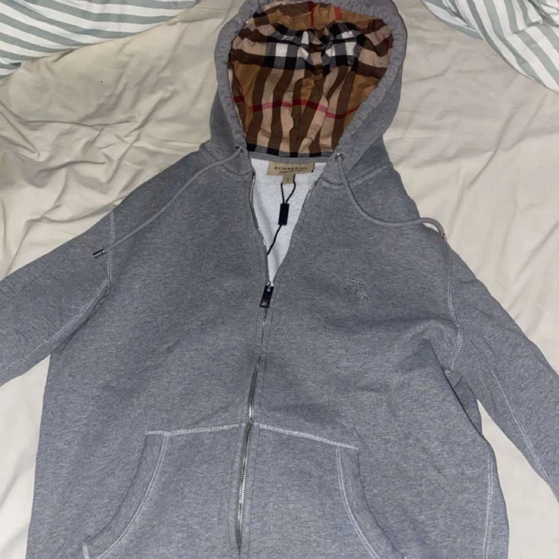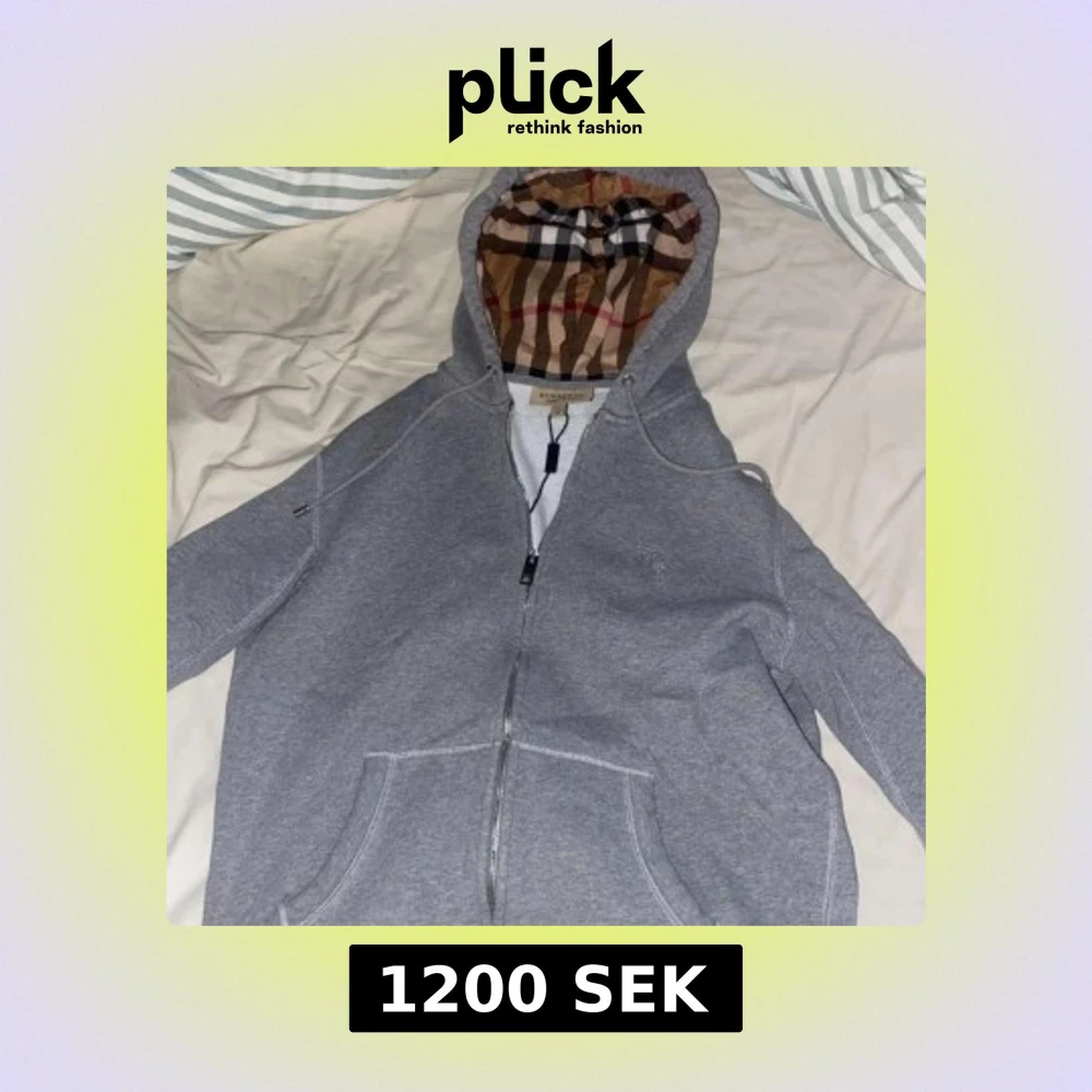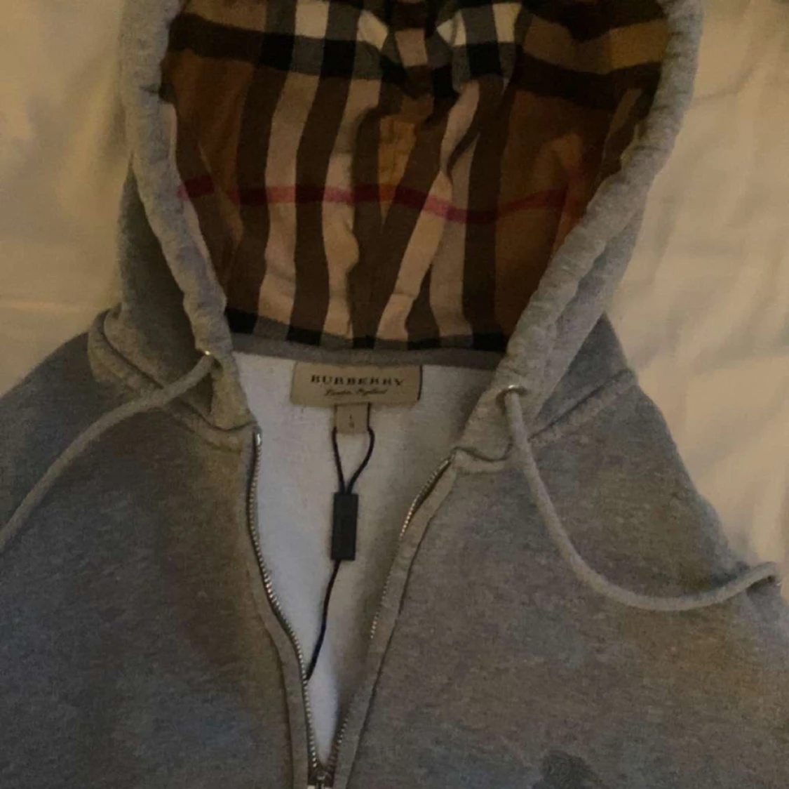 Säljer en stilren grå huvtröja från Burberry med klassiskt rutigt mönster i huvan. Tröjan har dragkedja framtill och praktiska fickor. Perfekt för en avslappnad look.