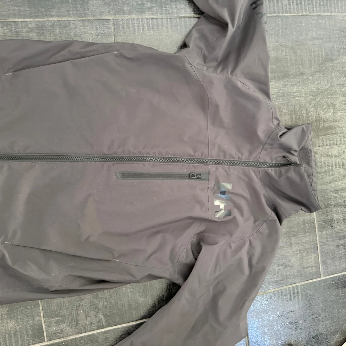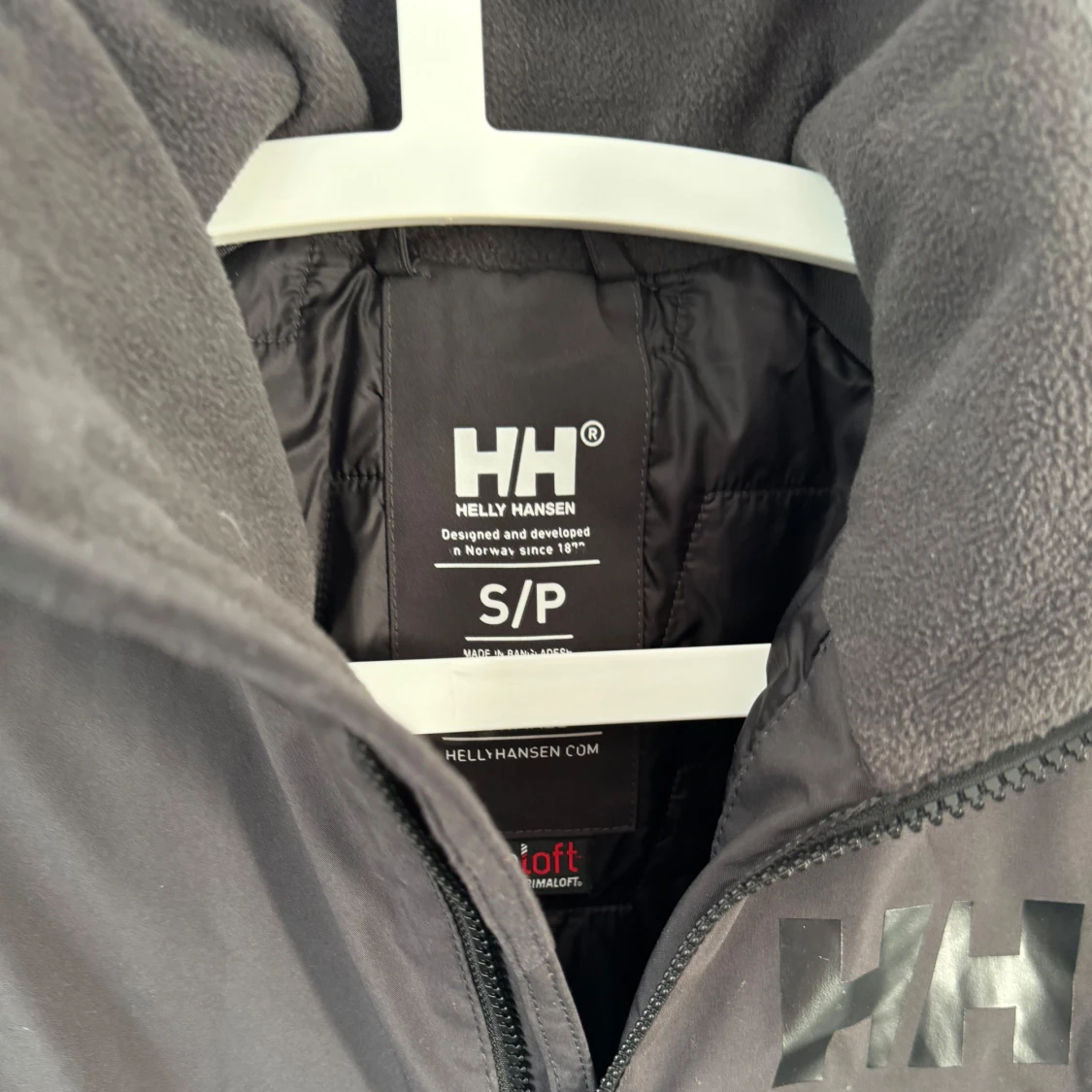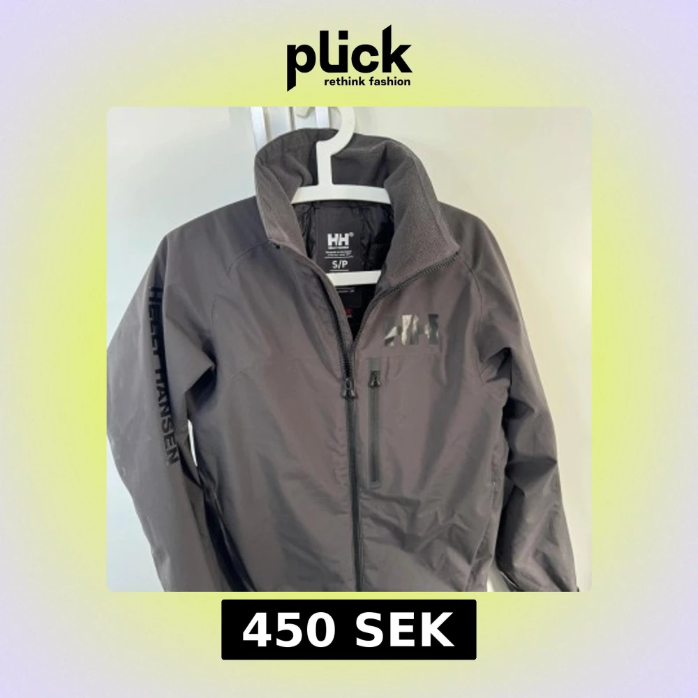 Säljer en grå jacka från Helly Hansen med dragkedja och hög krage. Jackan har en diskret logga på bröstet och är tillverkad i ett syntetmaterial. Perfekt för kyligare dagar.