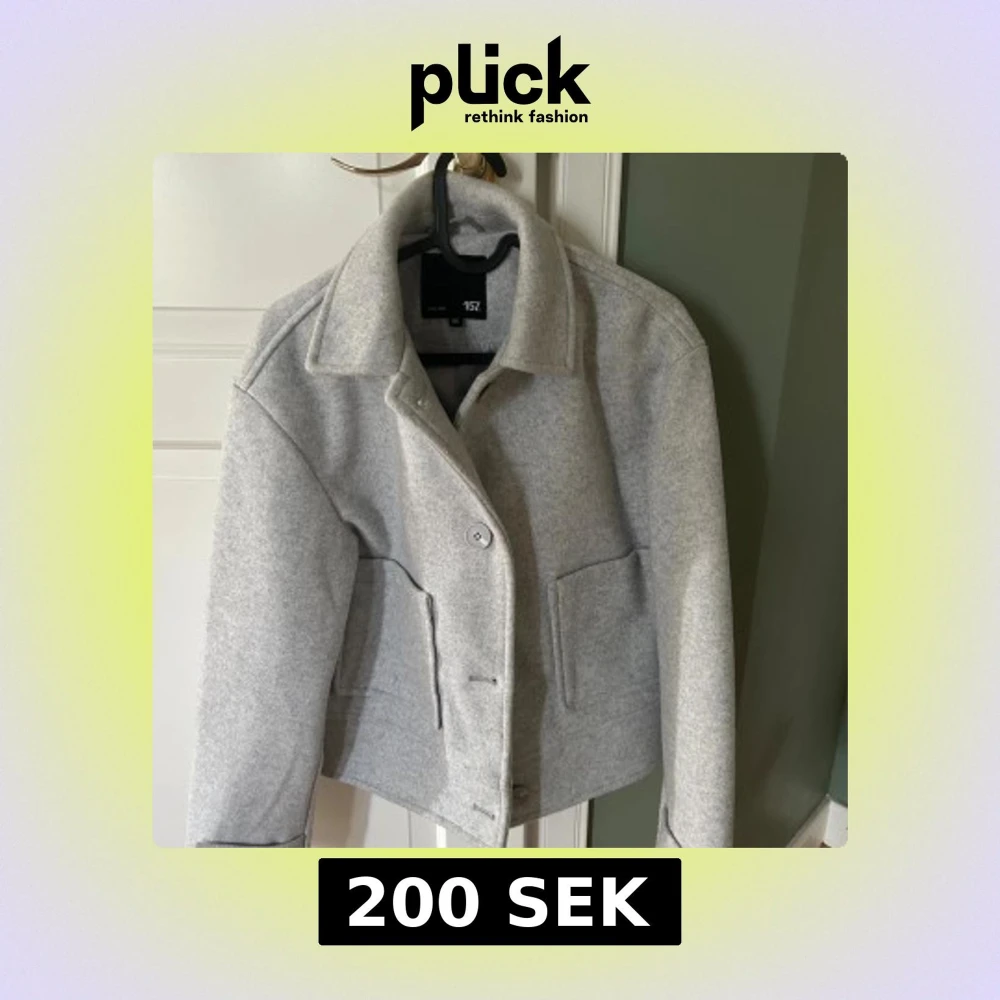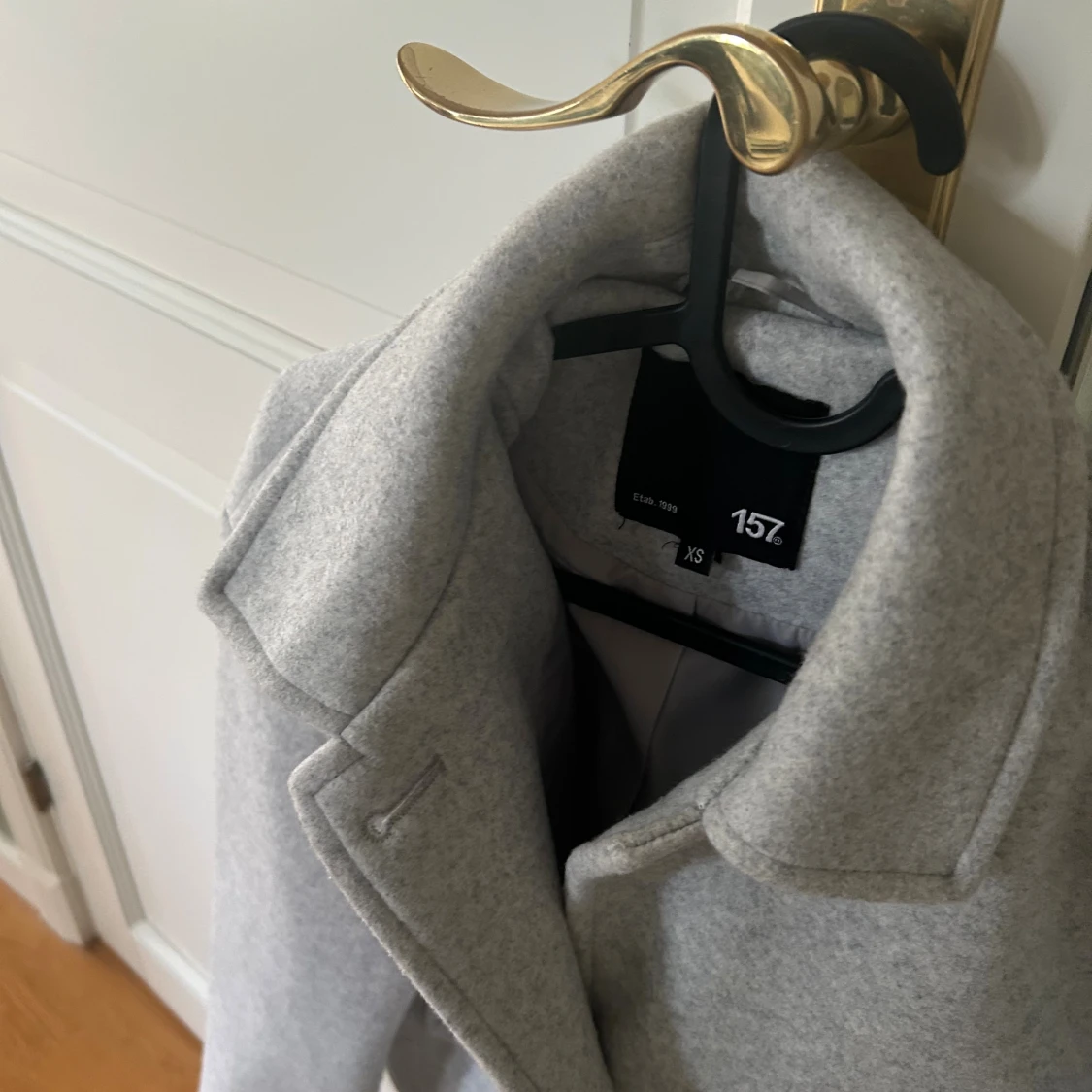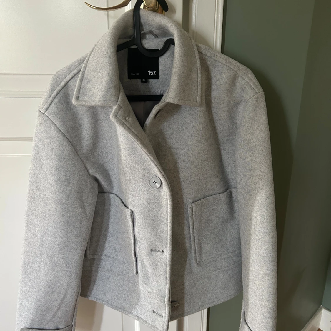 Säljer en ljusgrå jacka från 157 i ullblandning. Jackan har klassisk krage, stora fickor framtill och stängs med knappar. Den är lite boxig i modellen och har långa ärmar. Perfekt för dig som gillar stilren och enkel design. Använd fåtal gånger