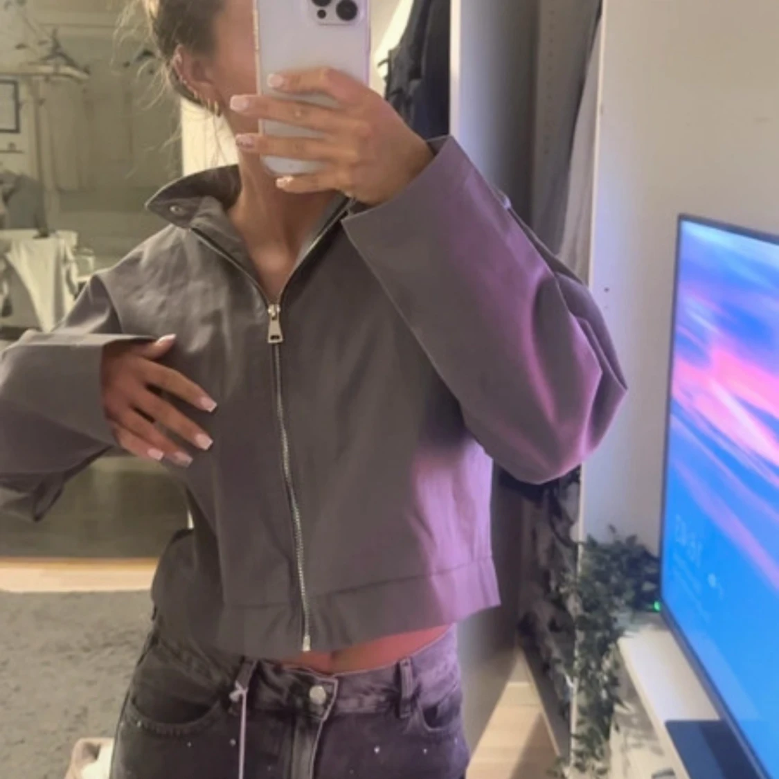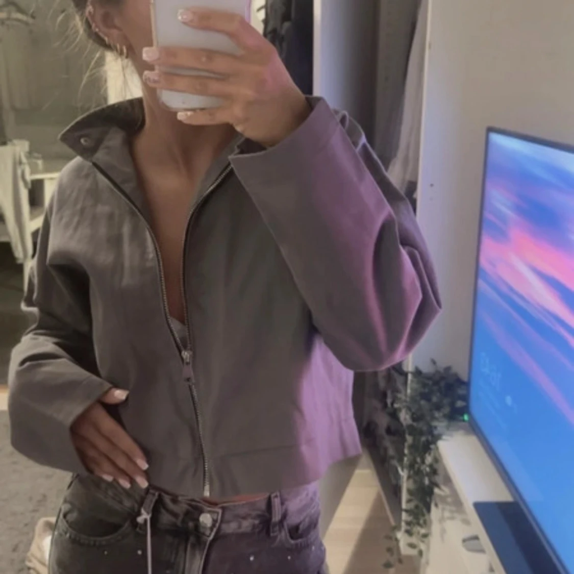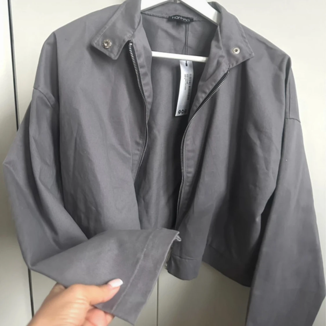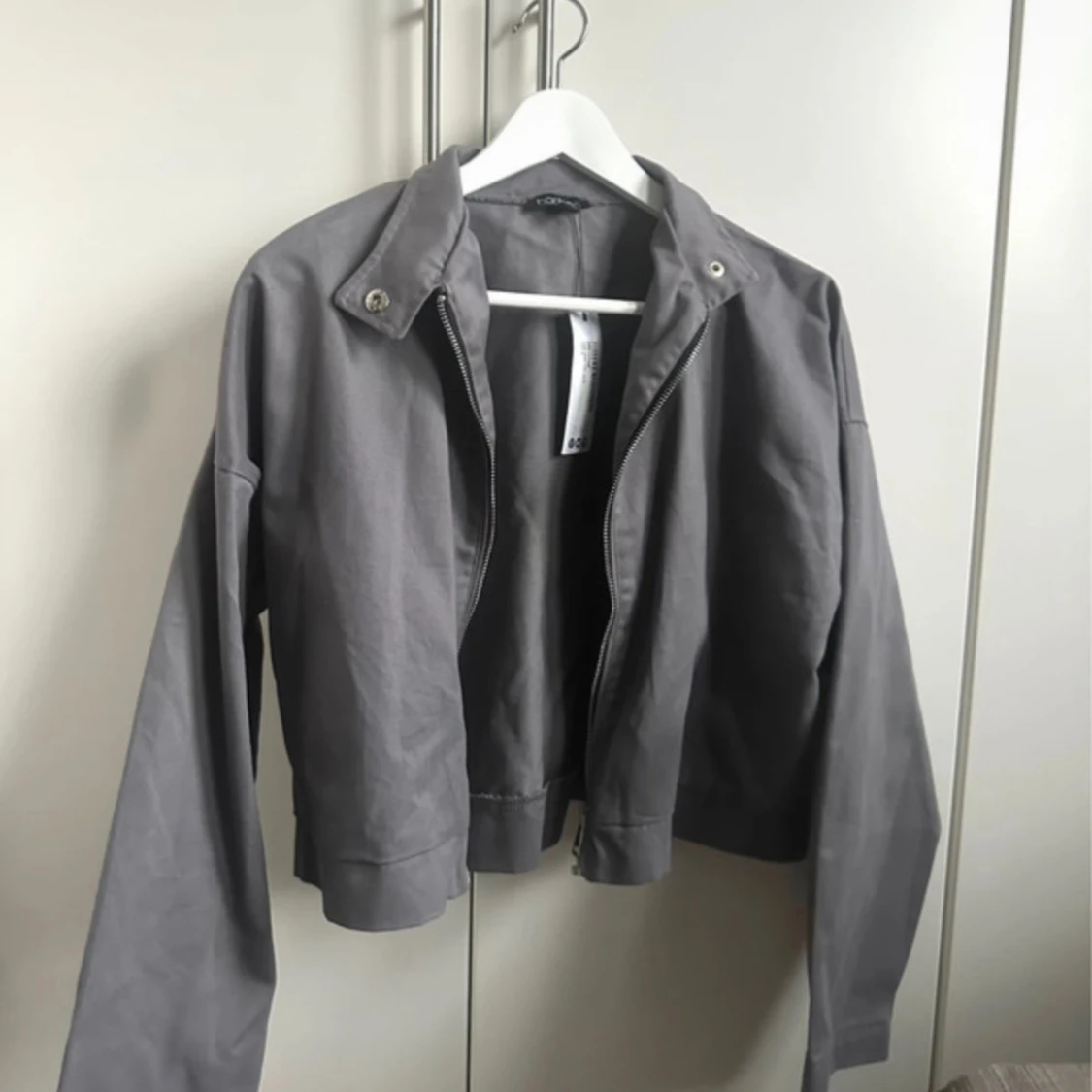 Snygg grå jacka med prislappar kvar och med dragkedja framtill och bred krage med tryckknappar. Jackan har långa ärmar och en loose fit, perfekt för dig som gillar en avslappnad stil. Tillverkad i bomullsmaterial som känns skönt mot huden.