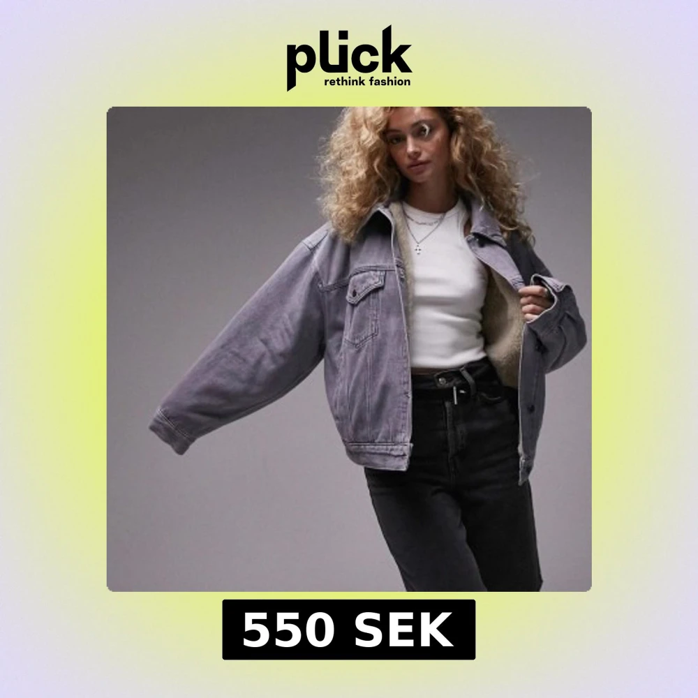 Oversized grå jeansjacka från Topshop med mjukt beige teddyfoder. Klassisk modell med två bröstfickor, knappar framtill och bred krage. Perfekt för lager-på-lager och ger en cool, avslappnad vibe till din outfit.