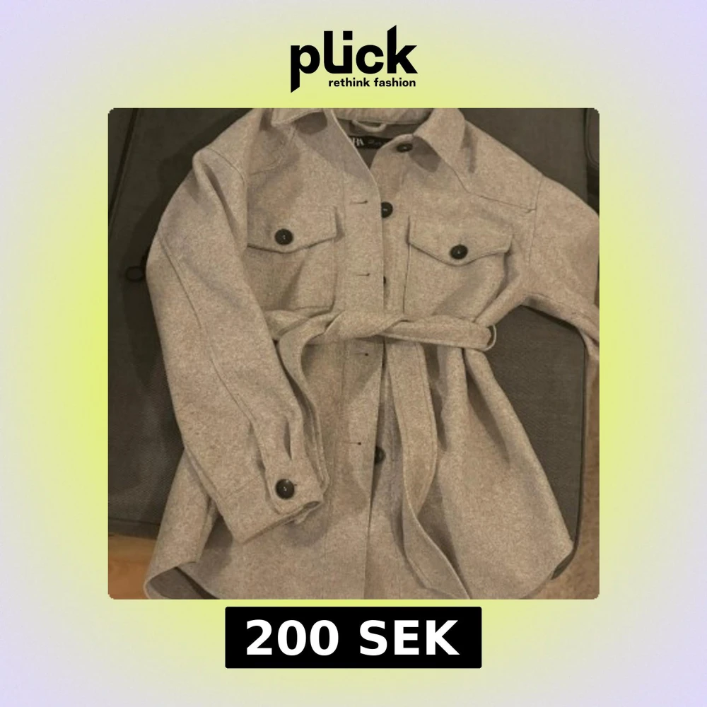 Grå kappa med svarta knappar och bälte i midjan. Från zara