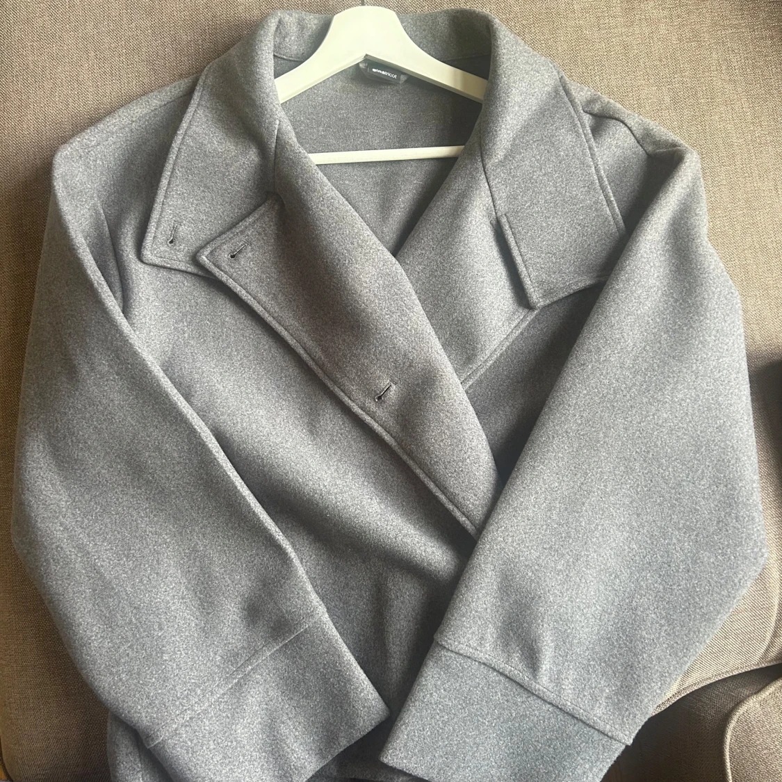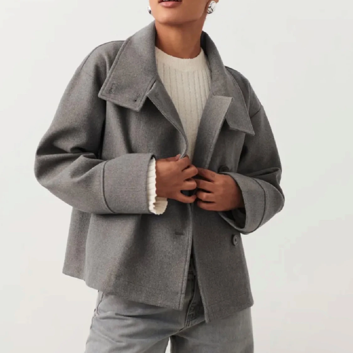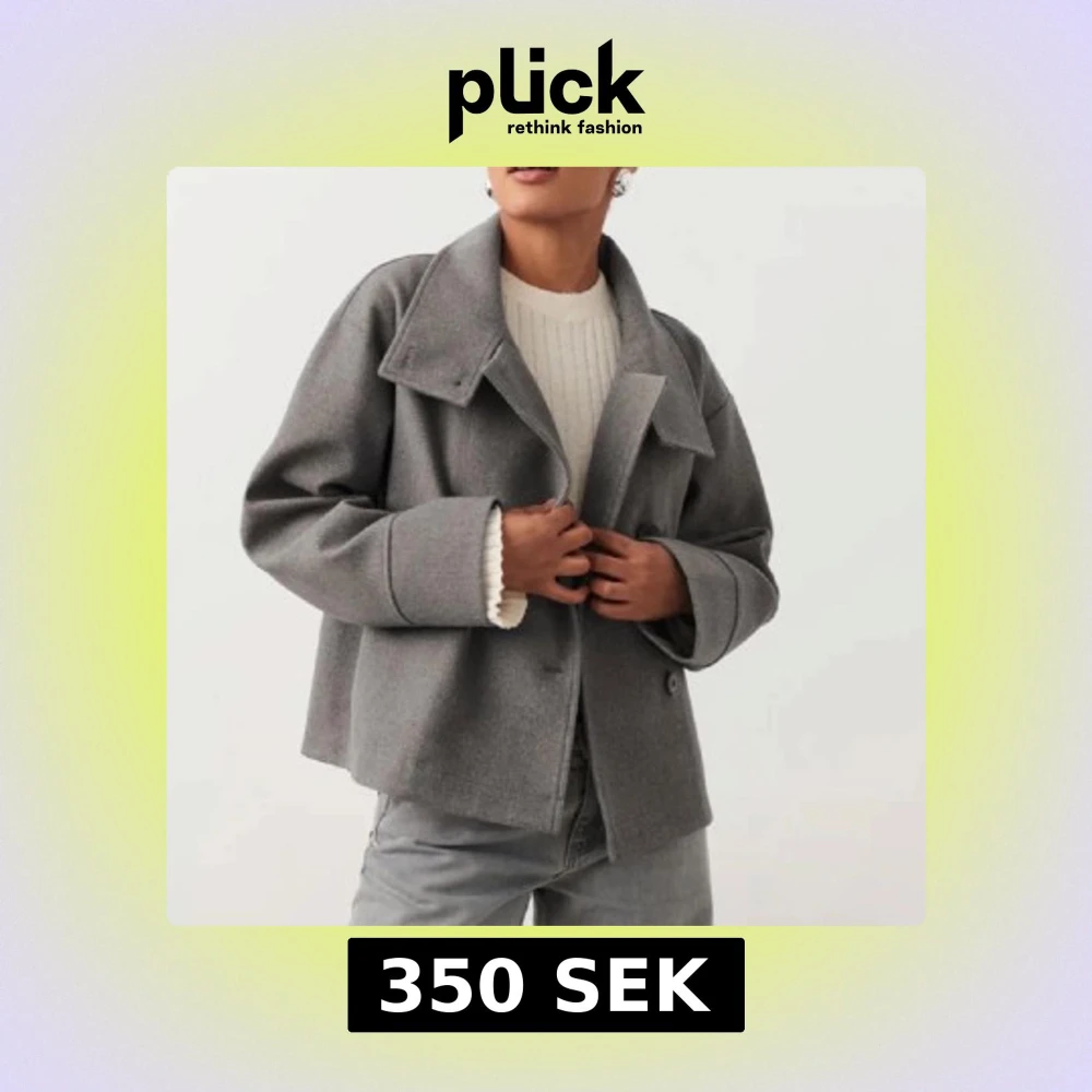 Kort grå kappa från Gina tricot med knäppning framtill. Väldigt fint skick, knappt använd. Strl L men passar mig som vanligtvis har M i jackor!