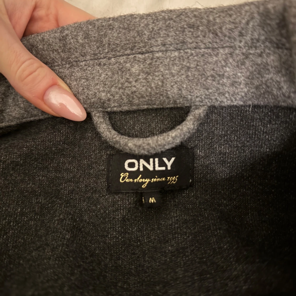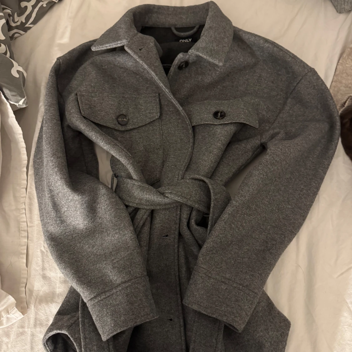Säljer en stilren grå kappa från ONLY med knappar och knytskärp i midjan. Jackan har långa ärmar och två bröstfickor med lock. Perfekt för lager-på-lager-stil under kyligare dagar.