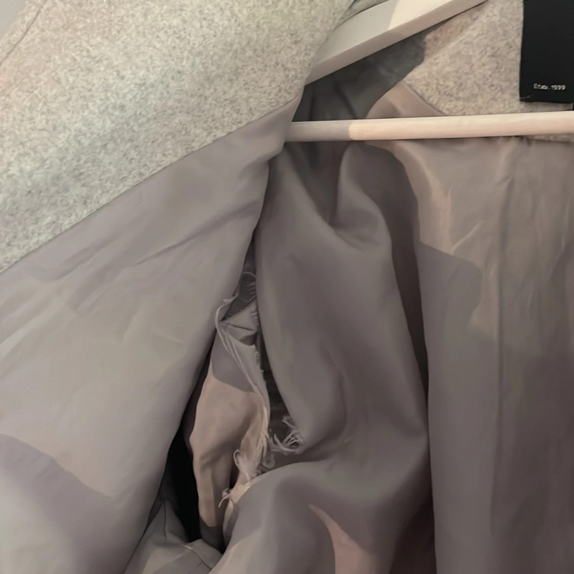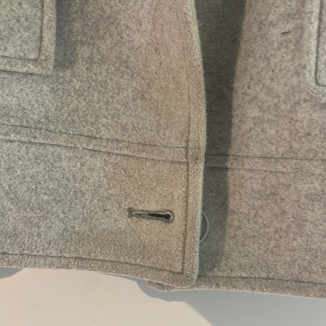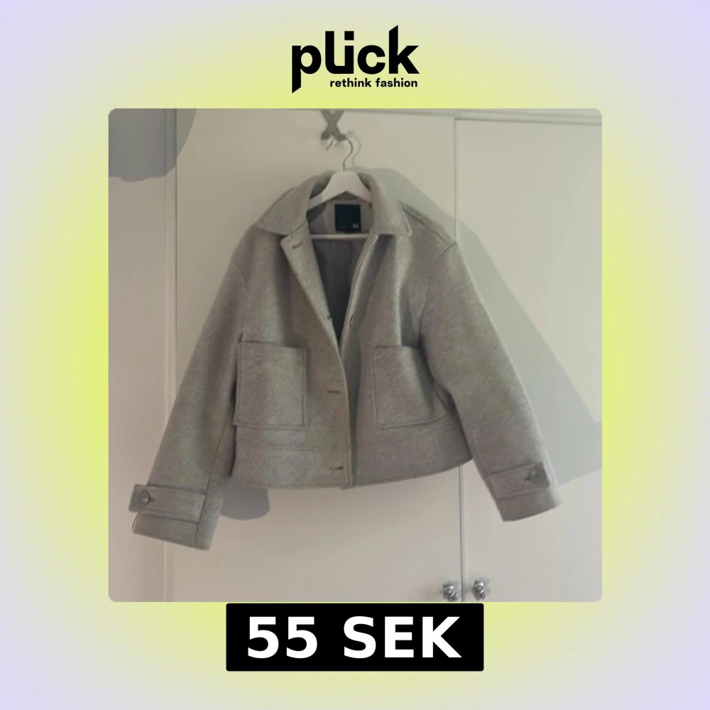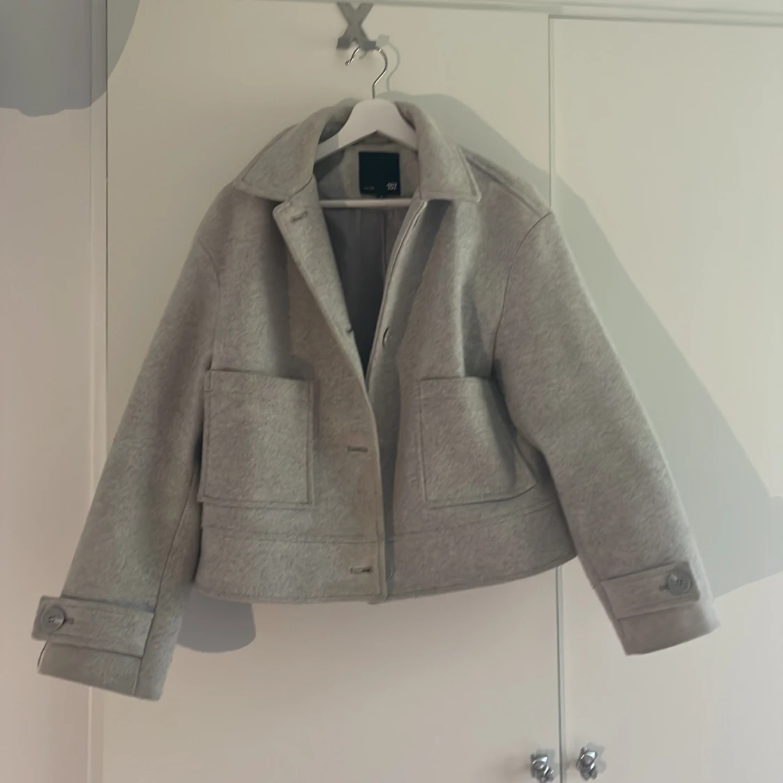 Snygg grå jacka från lager 157 i ullblandning med fickor framtill och krage. Jackan är croppad och har knappar både framtill och vid ärmsluten. Skicketr bra men finns tecken på användning. En söm i innertyget har gått upp, det går dock att sy igen. Ny: 400kr