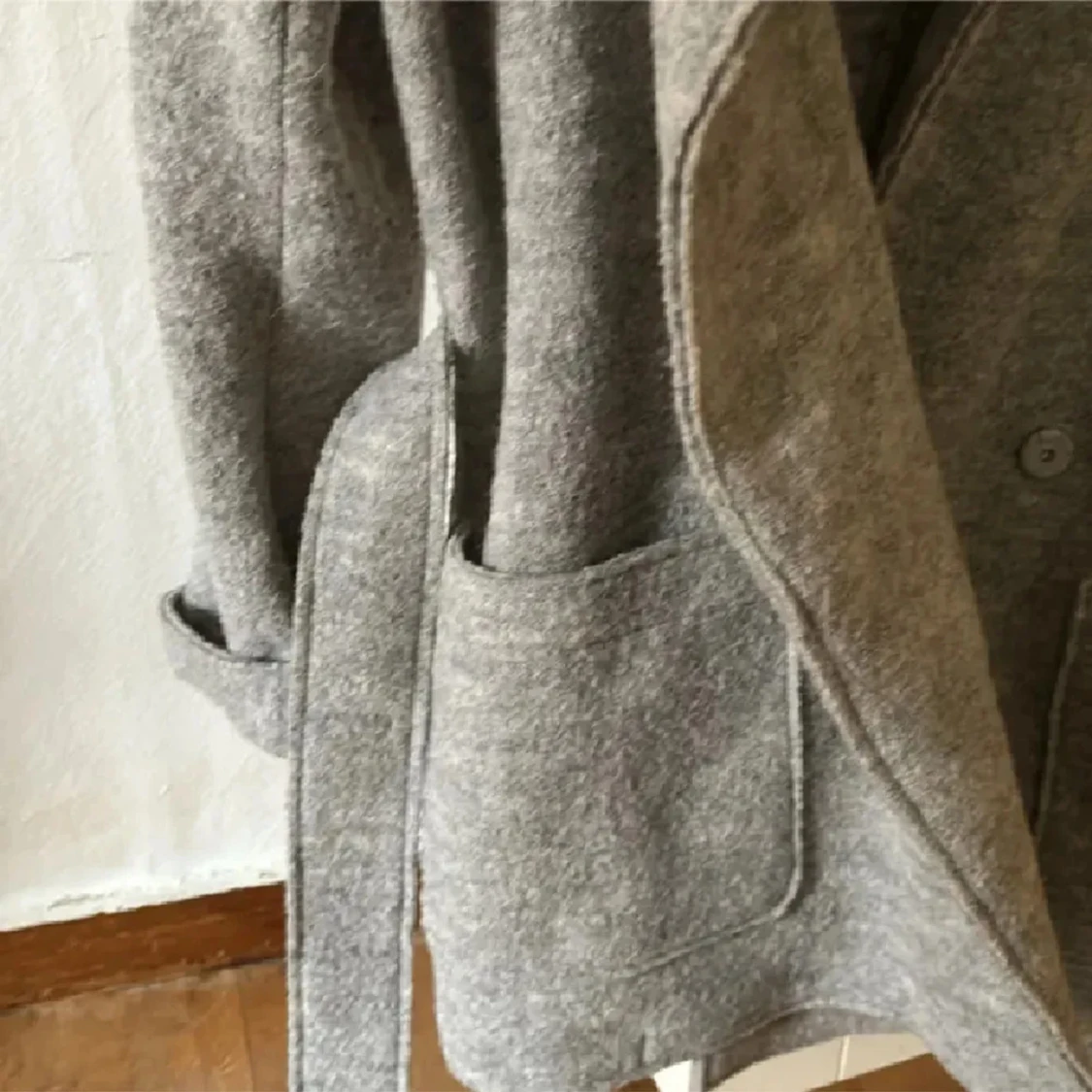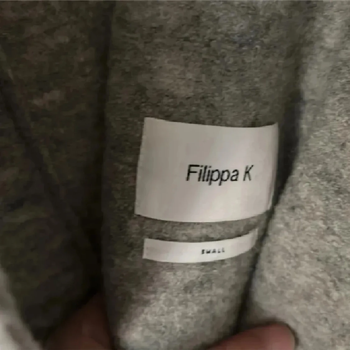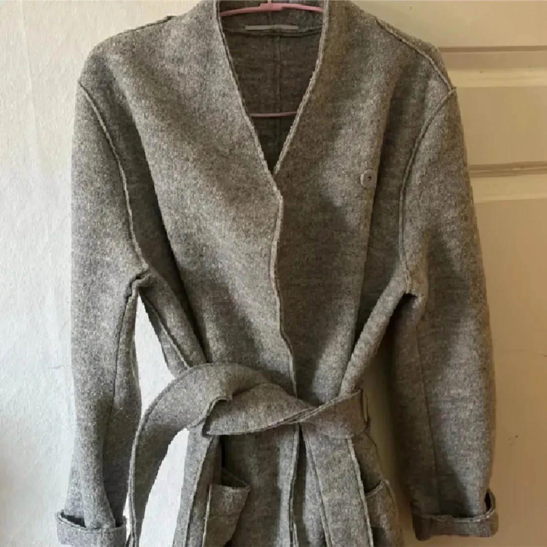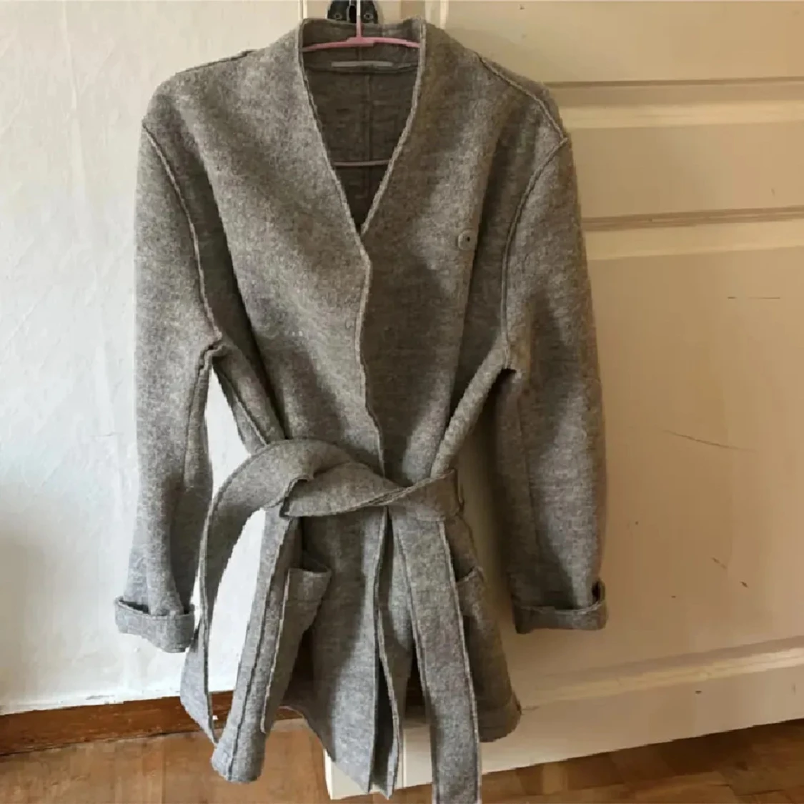 Snygg grå kappa från Filippa K i mjuk ullmix. Omlottmodell med bälte i midjan, stora fickor och långa ärmar. Perfekt för dig som gillar stilren och minimalistisk look. Passar till allt och är superenkel att matcha. En knapp saknas men inget som stör då man kan knyta annars lättfixat för den som kan se sista bilden❤️