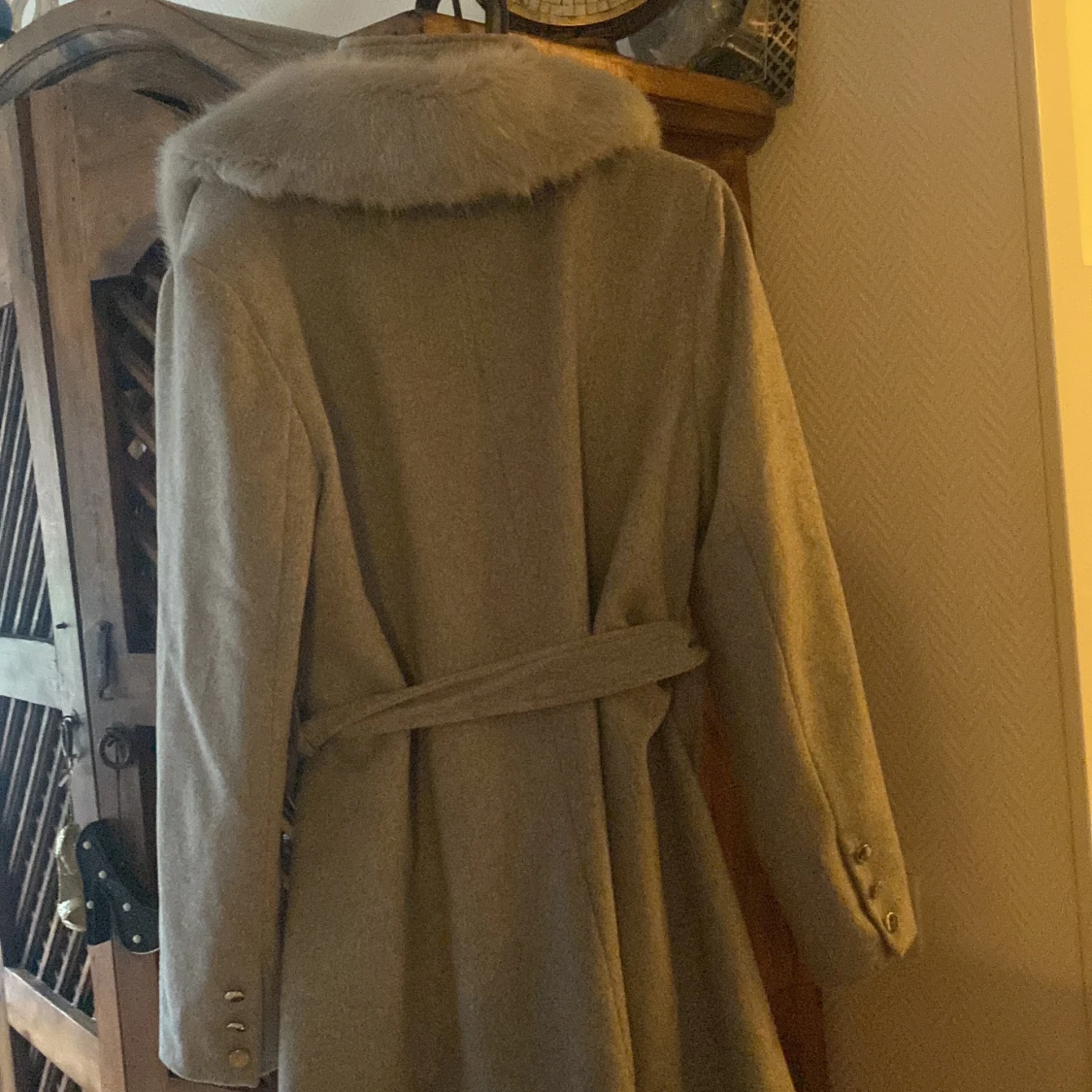 Elegant grå kappa med en lyxig pälskrage och knytbälte i midjan. Perfekt för kyliga dagar när du vill känna dig både varm och stilren. Kappan har långa ärmar och knappar vid ärmsluten för extra detalj.