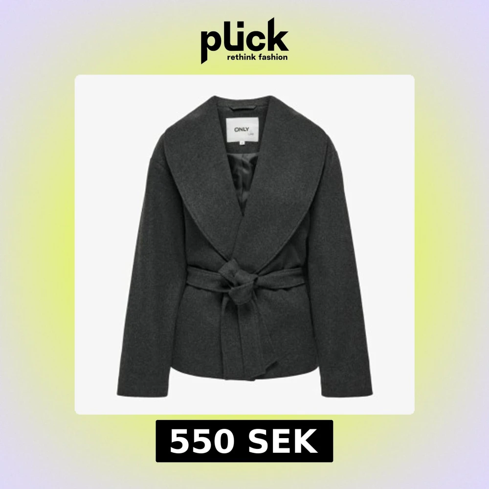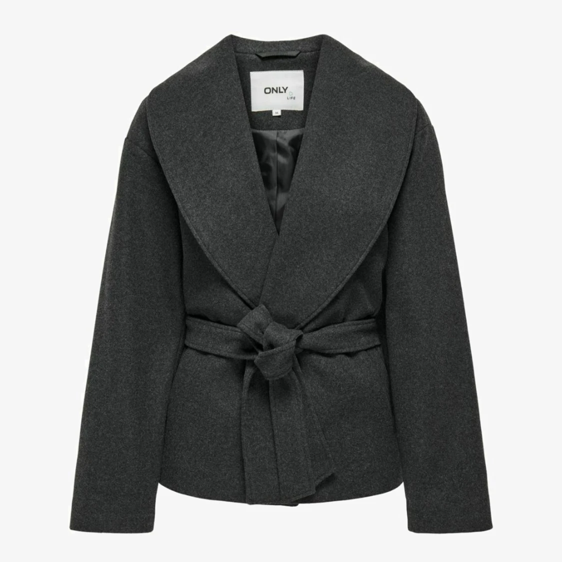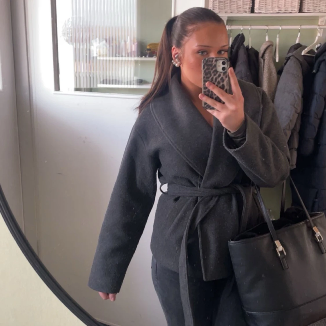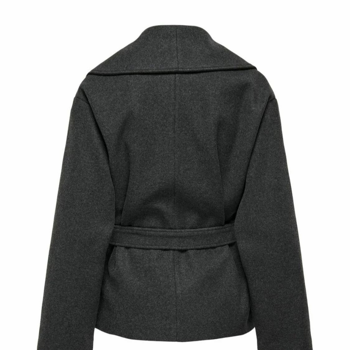 Snygg mörkgrå jacka från ONLY med bred krage och knytskärp i midjan.Jätte najs och lagom varm till hösten. Köpt för 679kr på zalando