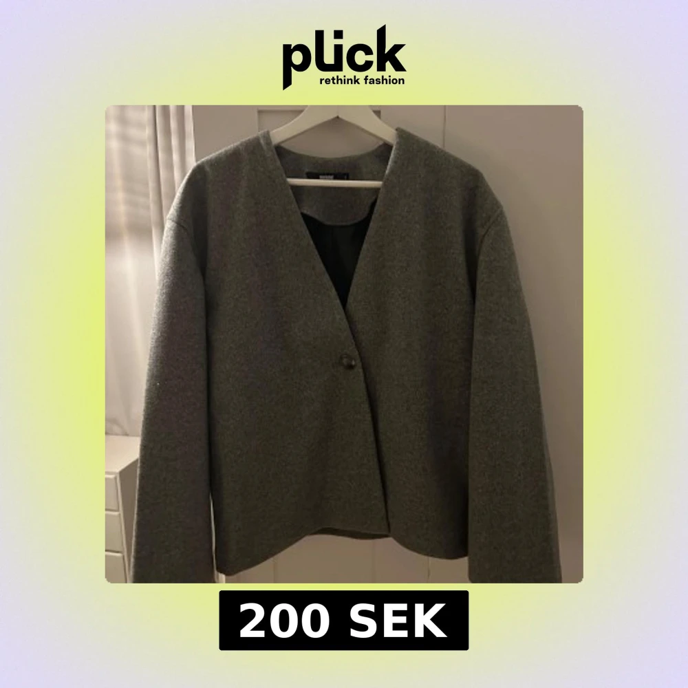 Snygg grå kavaj från BikBok i storlek S. Den har en stilren design med en enkel knapp framtill och långa ärmar. Perfekt för en chic och minimalistisk look.