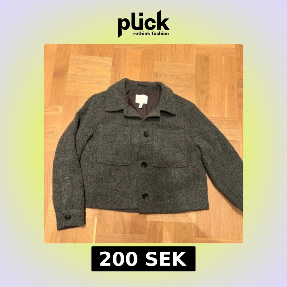 Säljer en grå kort jacka/kappa från H&M i ullblandning. Jackan har klassisk krage, stora bröstfickor med lock och knäppning framtill med svarta knappar. Perfekt för lager-på-lager och har en rak, boxig passform med långa ärmar.
