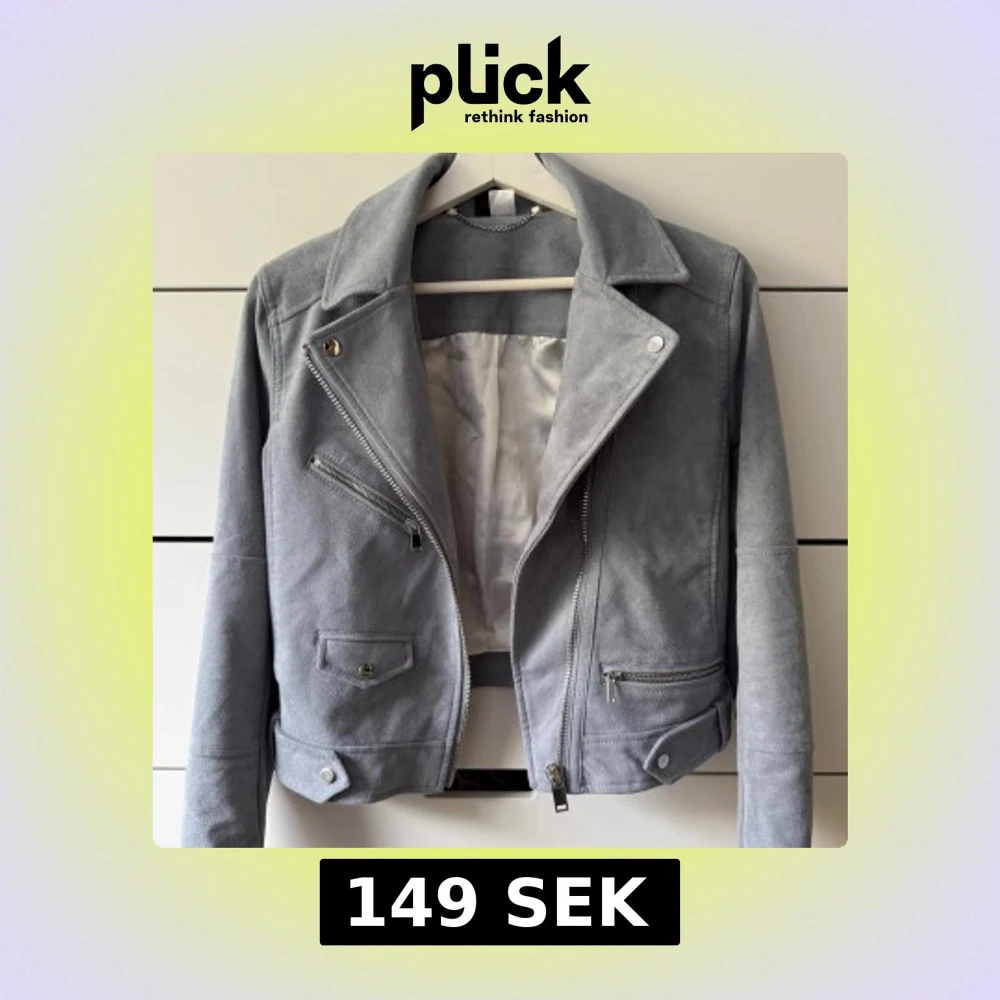 Snygg grå bikerjacka i mocka-look med silvriga dragkedjor och klassisk krage. Aldrig använd. Satin liknande material inuti. Liten I storlek.