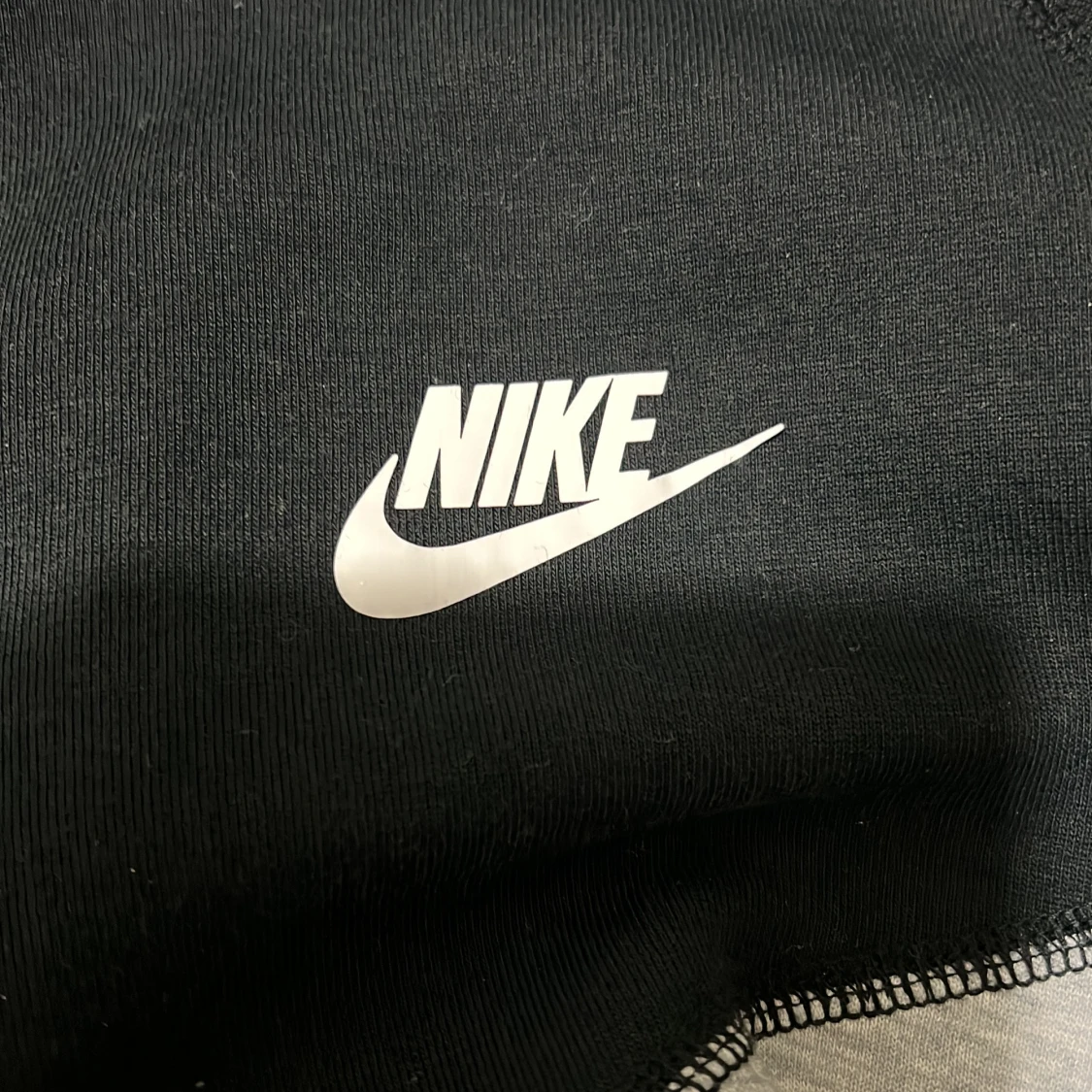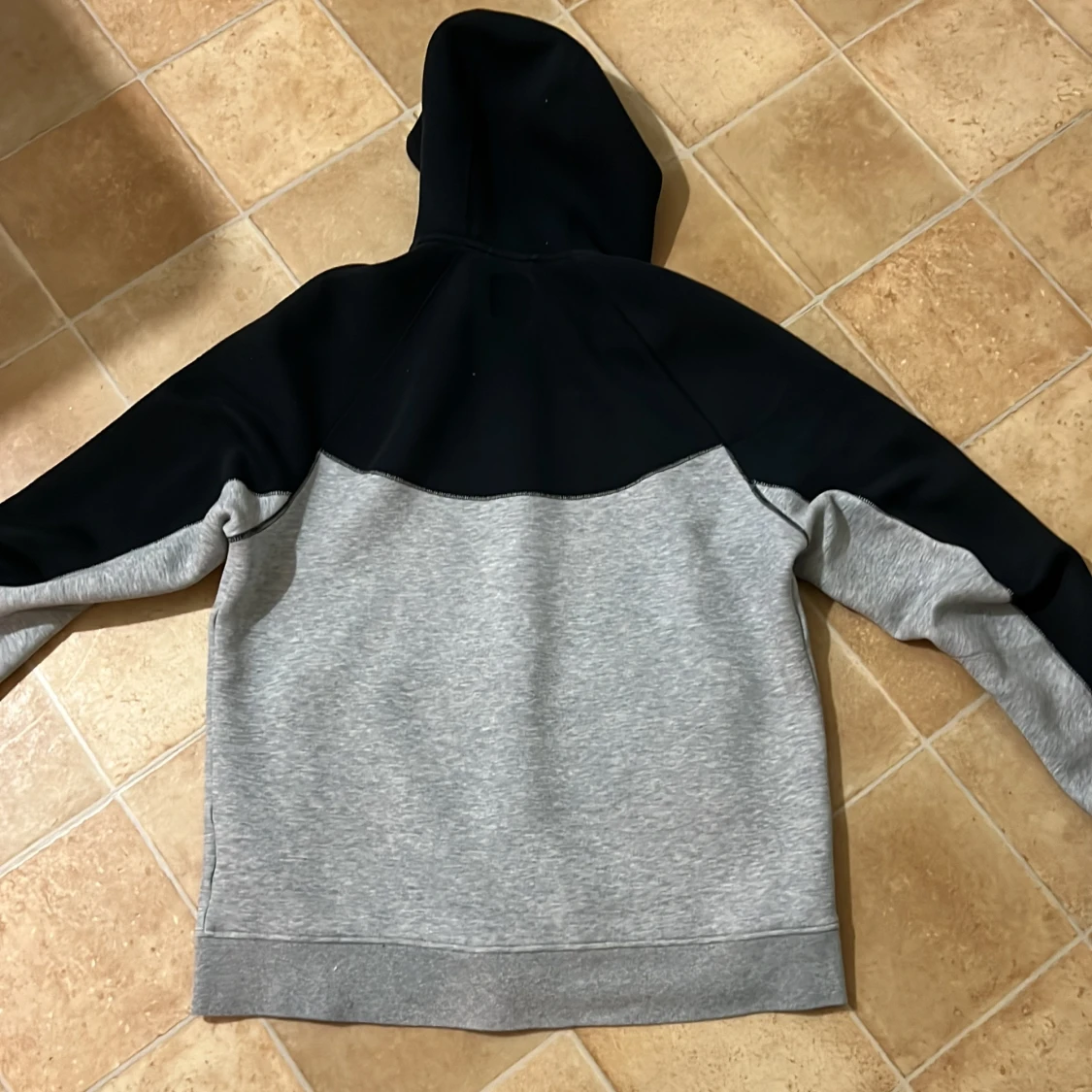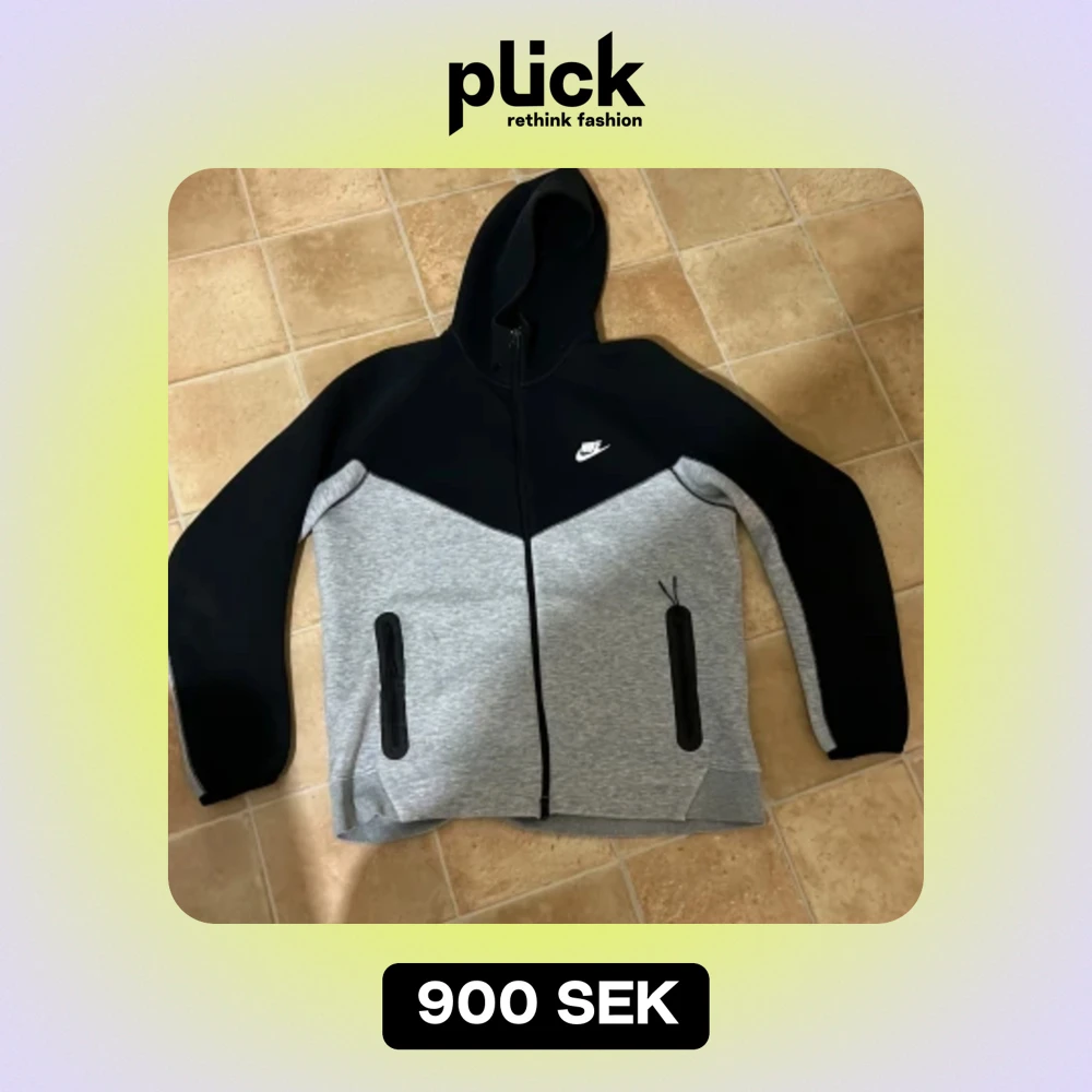 Säljer en snygg och bekväm grå och svart hoodie från Nike. Den har en dragkedja framtill och två praktiska fickor med dragkedjor. Perfekt för både träning och vardag. Hoodien är i nyskick och har en klassisk Nike-logga på bröstet.