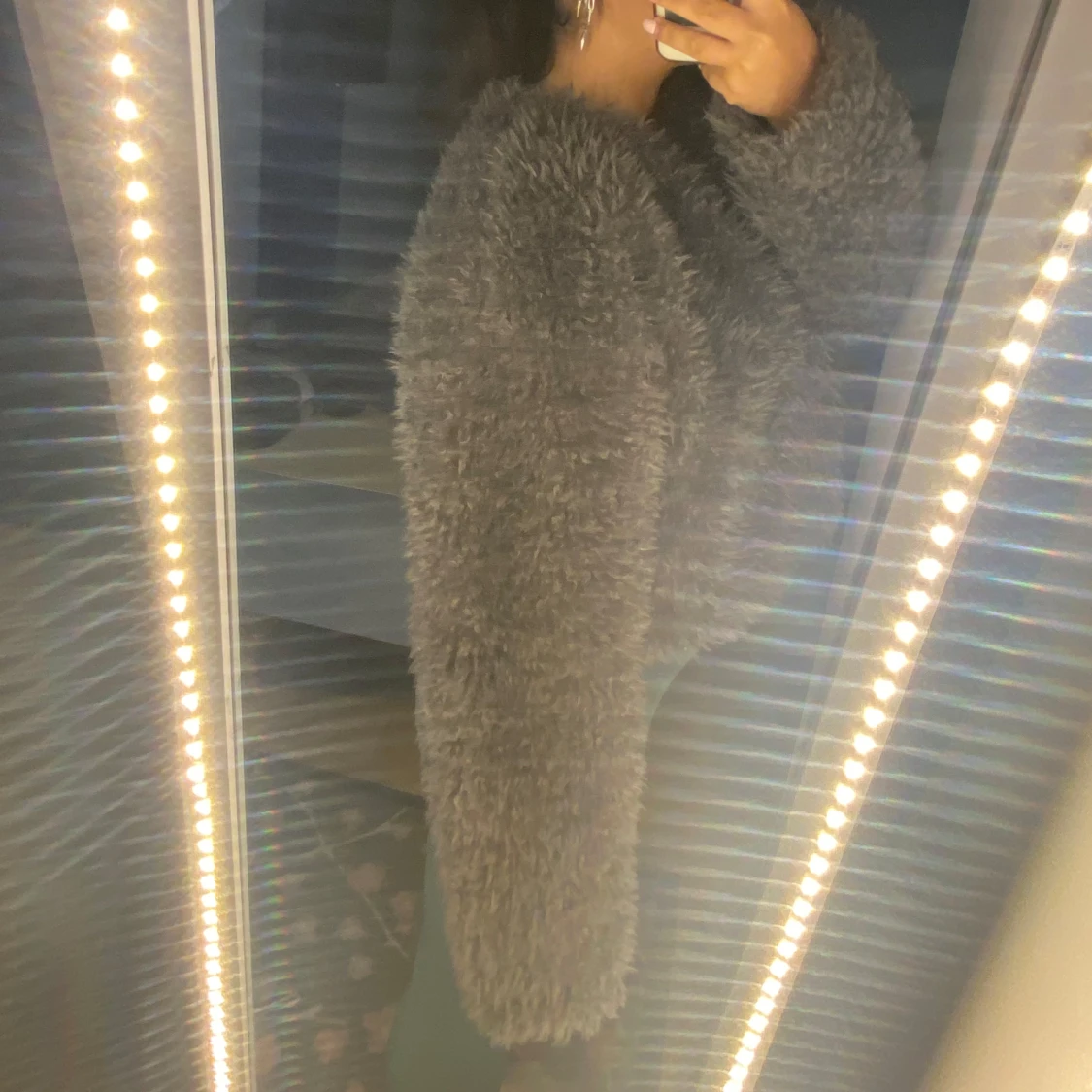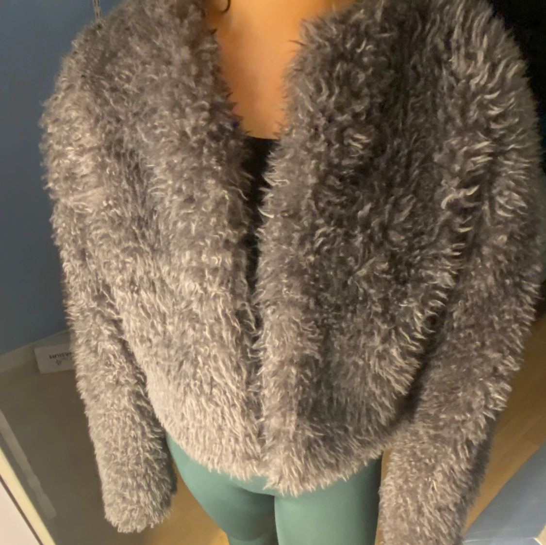 Mysig grå teddyjacka i fluffigt material, perfekt för kyliga dagar. Jackan har en loose passform och långa ärmar, vilket gör den superbekväm och trendig. Perfekt för höst och vinter! Har använt det fåtal gånger