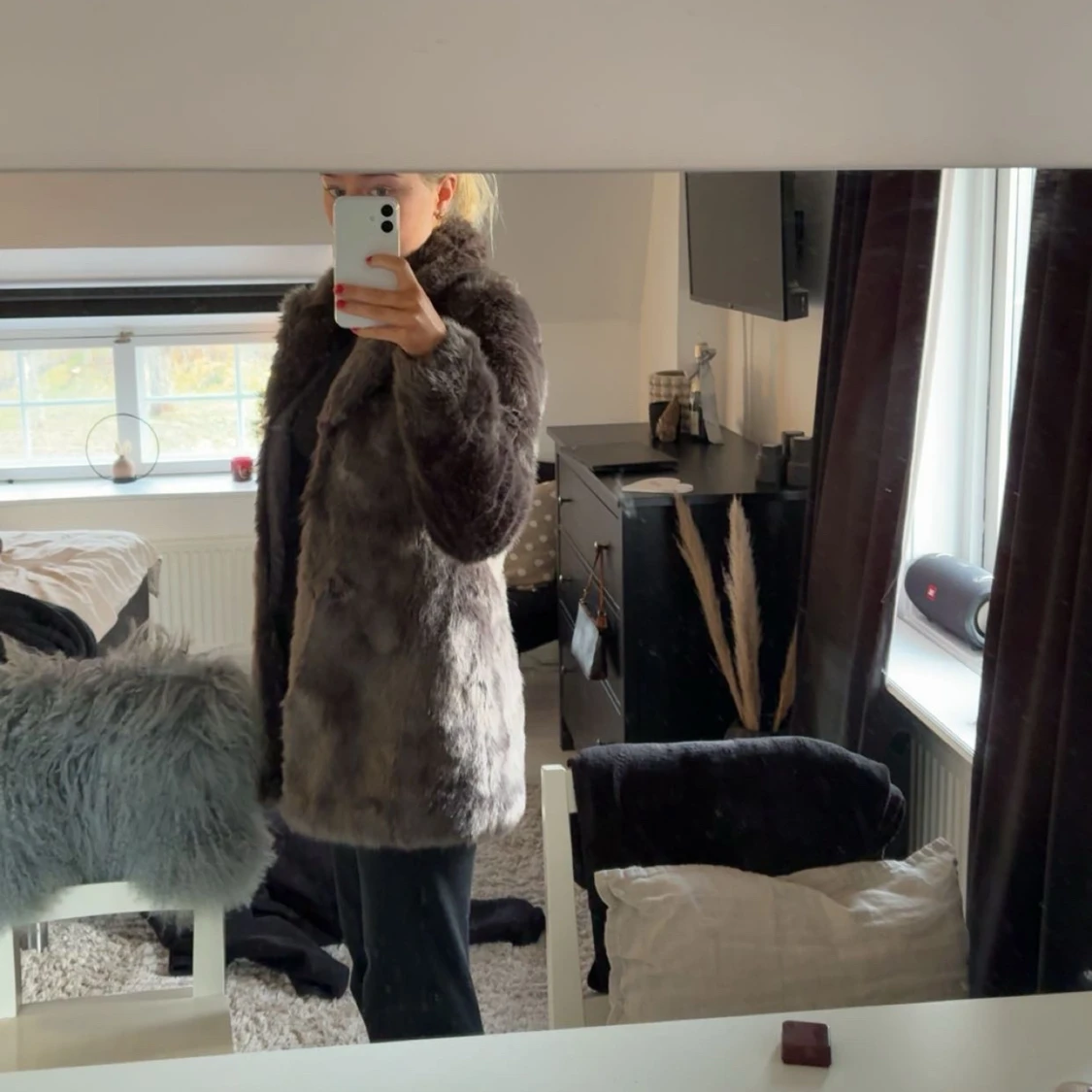 Säljer en elegant grå pälsjacka med lång ärm och mjukt foder. Perfekt för kyliga dagar när du vill känna dig både varm och stilren. Jackan har en klassisk design med en fin krage.