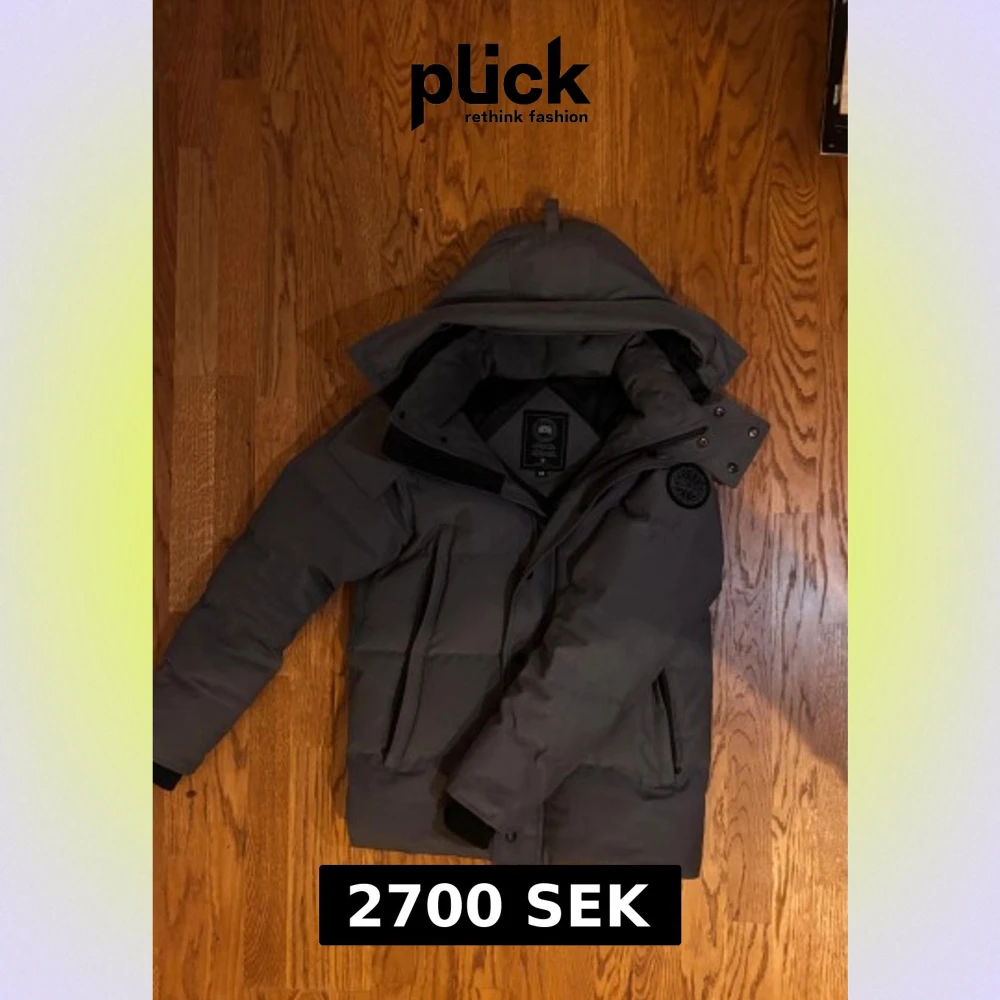 Säljer en grå pufferjacka från Canada Goose med huva och snygga svarta detaljer. Jackan har dragkedja, tryckknappar och två stora fickor framtill. Märkets patch sitter på ärmen och insidan har svart foder. Perfekt för kalla dagar. S passar också på M.