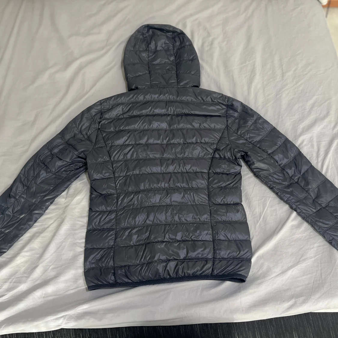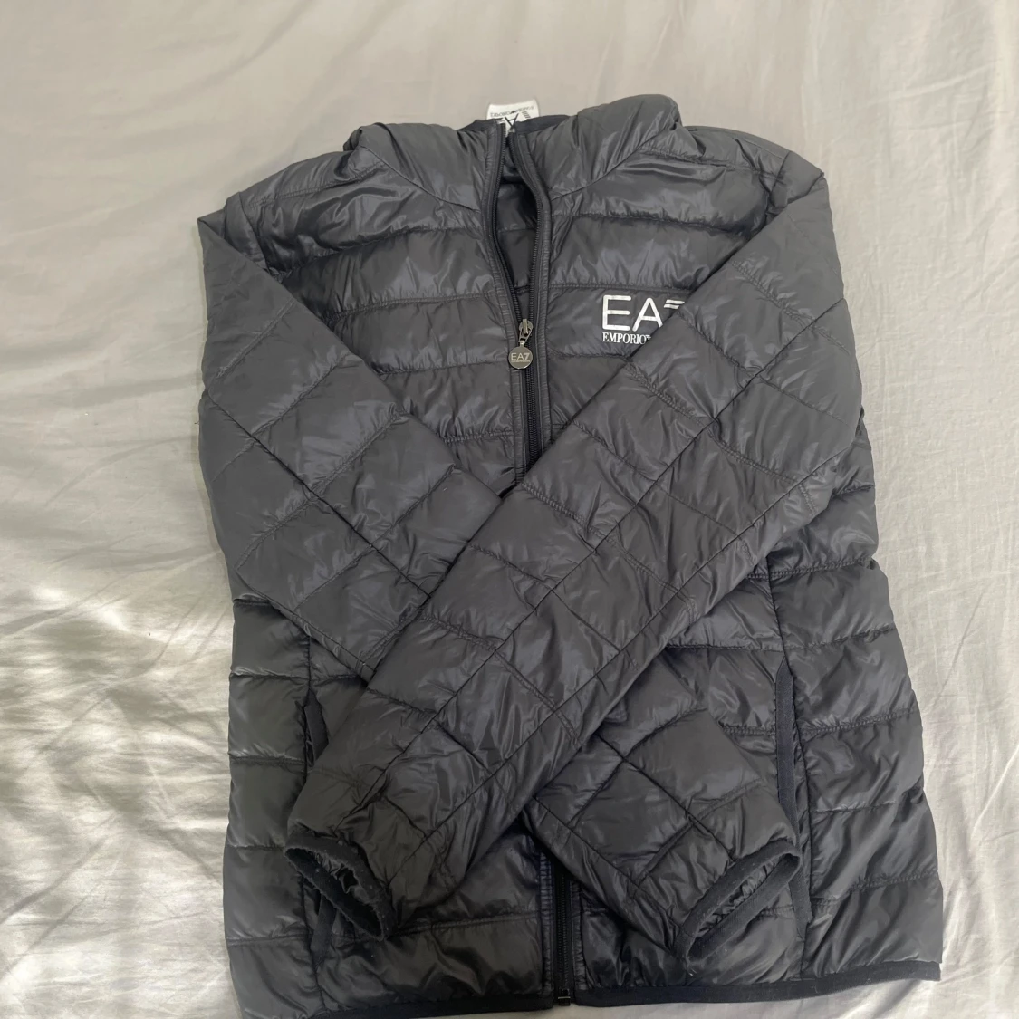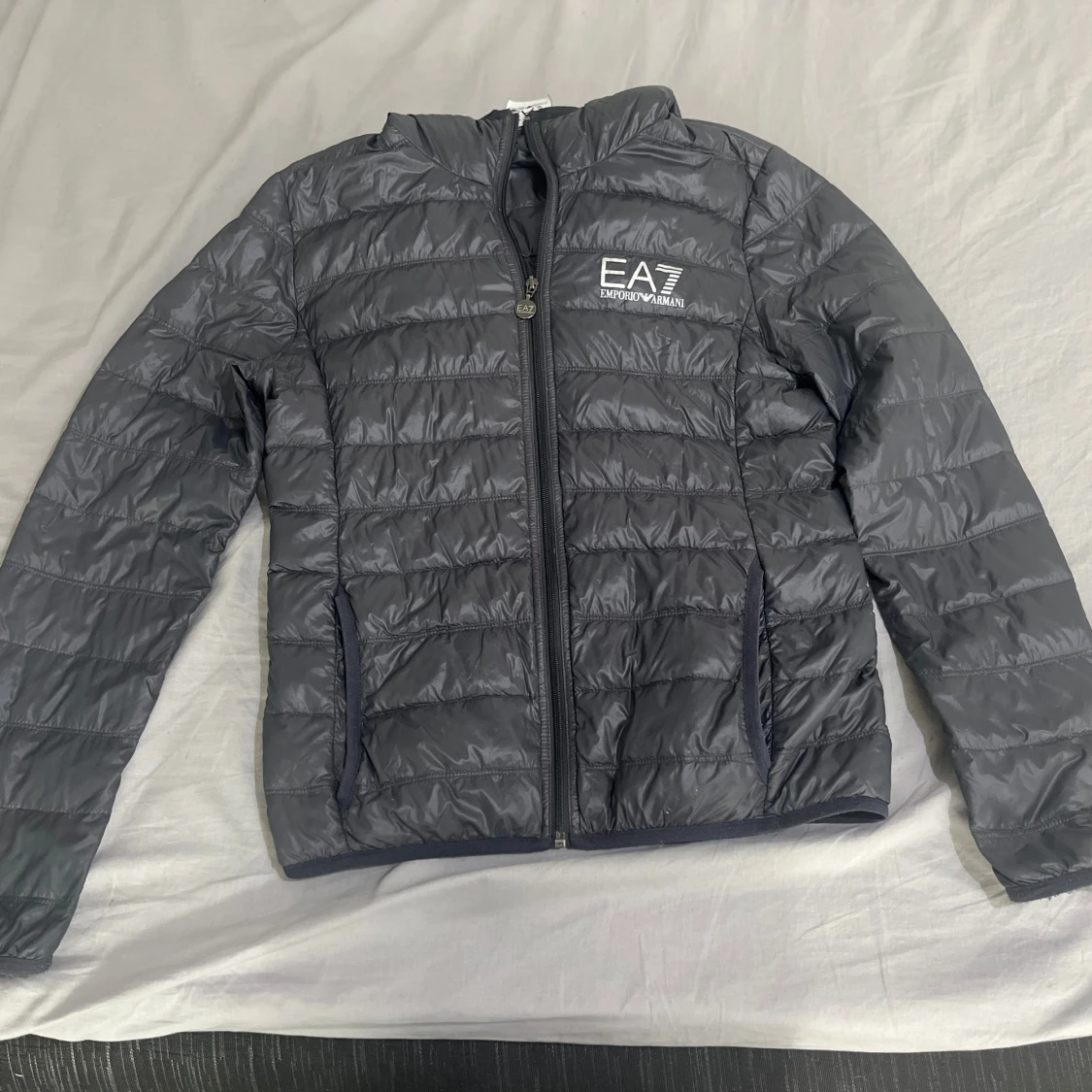 Säljer en grå pufferjacka från EA7 Emporio Armani med huva och dragkedja framtill. Jackan har quiltad design och logga på bröstet. Perfekt för kyliga dagar och enkel att matcha med olika outfits.