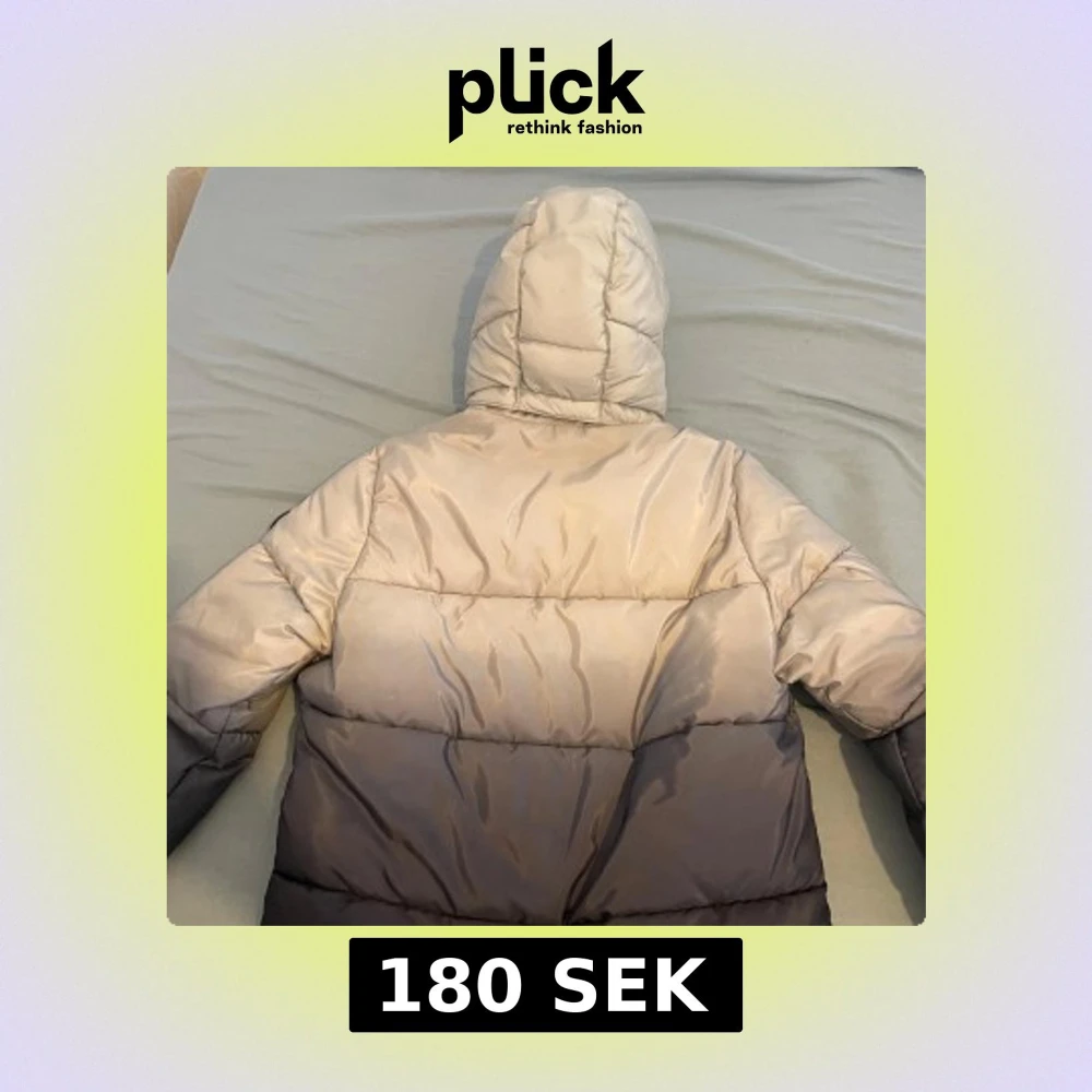 Snygg pufferjacka från H&M i en gradient från ljusgrå upptill till mörkgrå nedtill. Jackan har en stor, vadderad huva och dragkedja framtill. Fickor på sidorna och quiltad design ger en modern look. Perfekt för kalla dagar och enkel att matcha med streetwear.