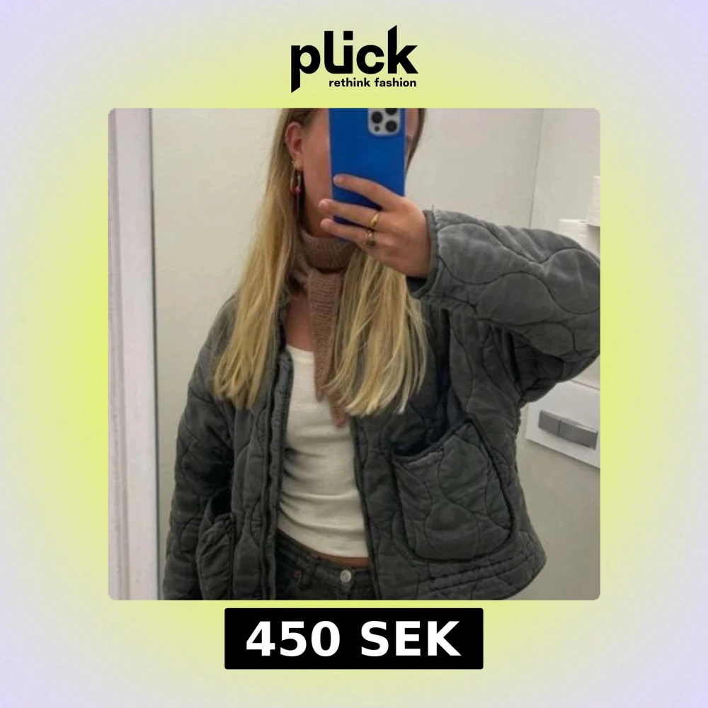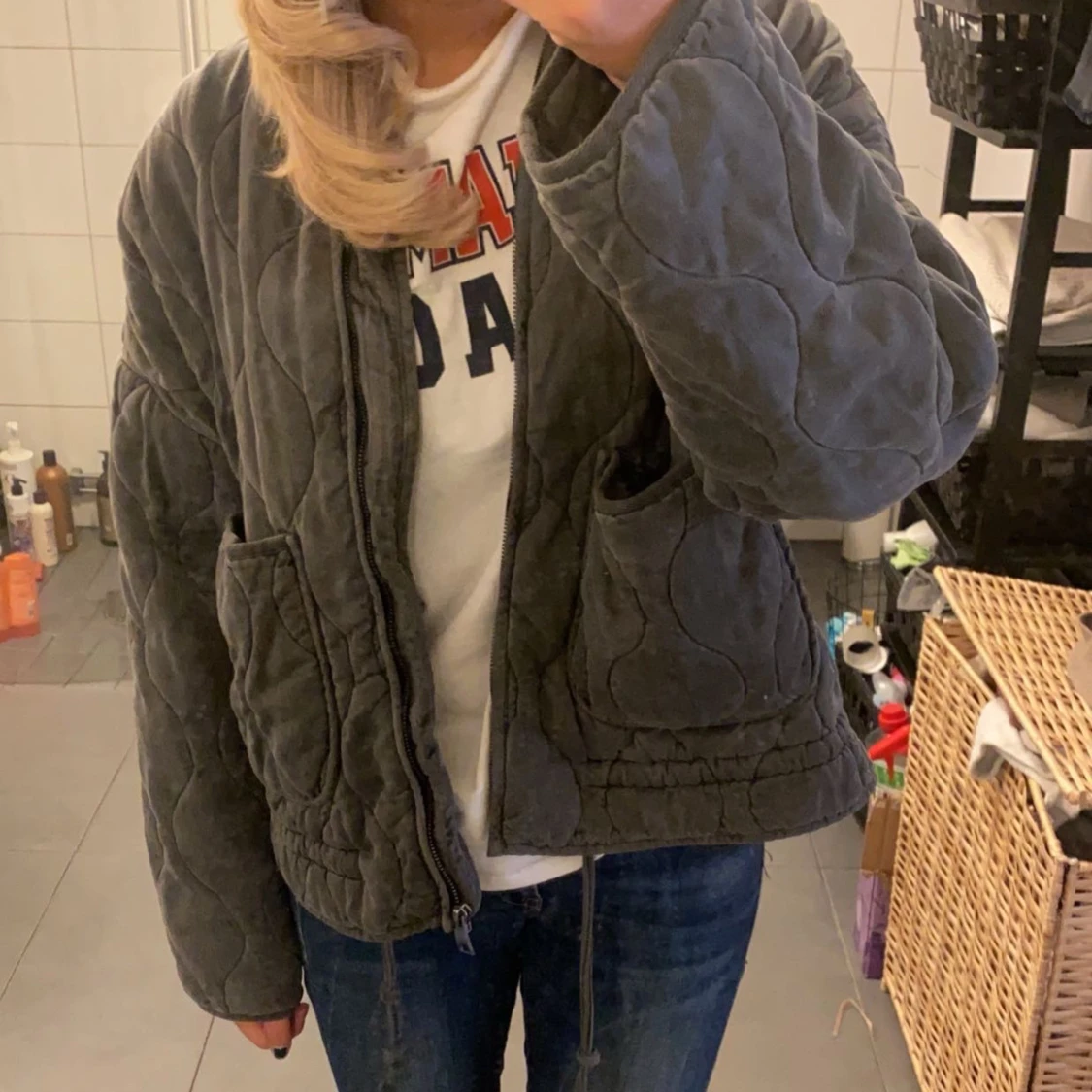 Säljer en grå quiltad bomberjacka med dragkedja framtill och två stora fickor. Jackan har en loose passform och är långärmad, perfekt för dig som gillar en chill och avslappnad stil. Materialet känns mjukt och jackan har snygga vågiga sömmar som ger extra edge.