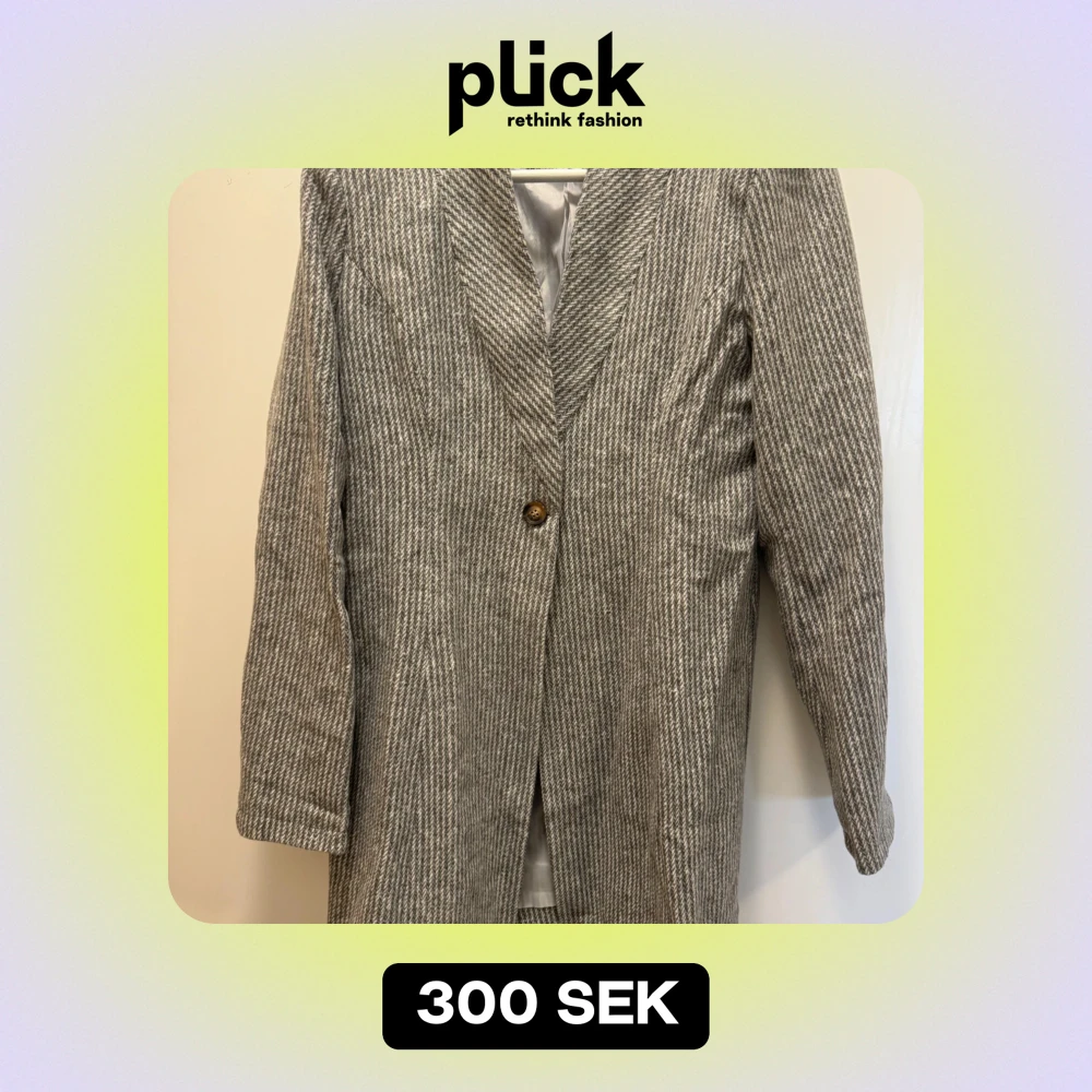 Säljer en stilren grå kavaj med diskreta ränder. Den har en enkel knapp framtill och är helfodrad för extra komfort. Perfekt för höst och vår, med en klassisk look som passar både till vardags och fest. Något figursydd.