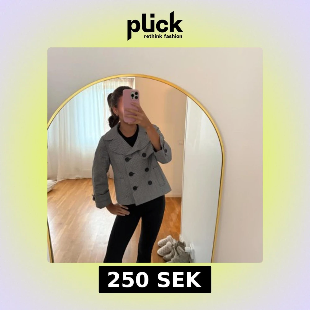 Snygg grå skepparkavaj med rutigt mönster. Jackan har dubbelknäppning med svarta knappar och uppvikta ärmslut. Passar en storlek s/xs