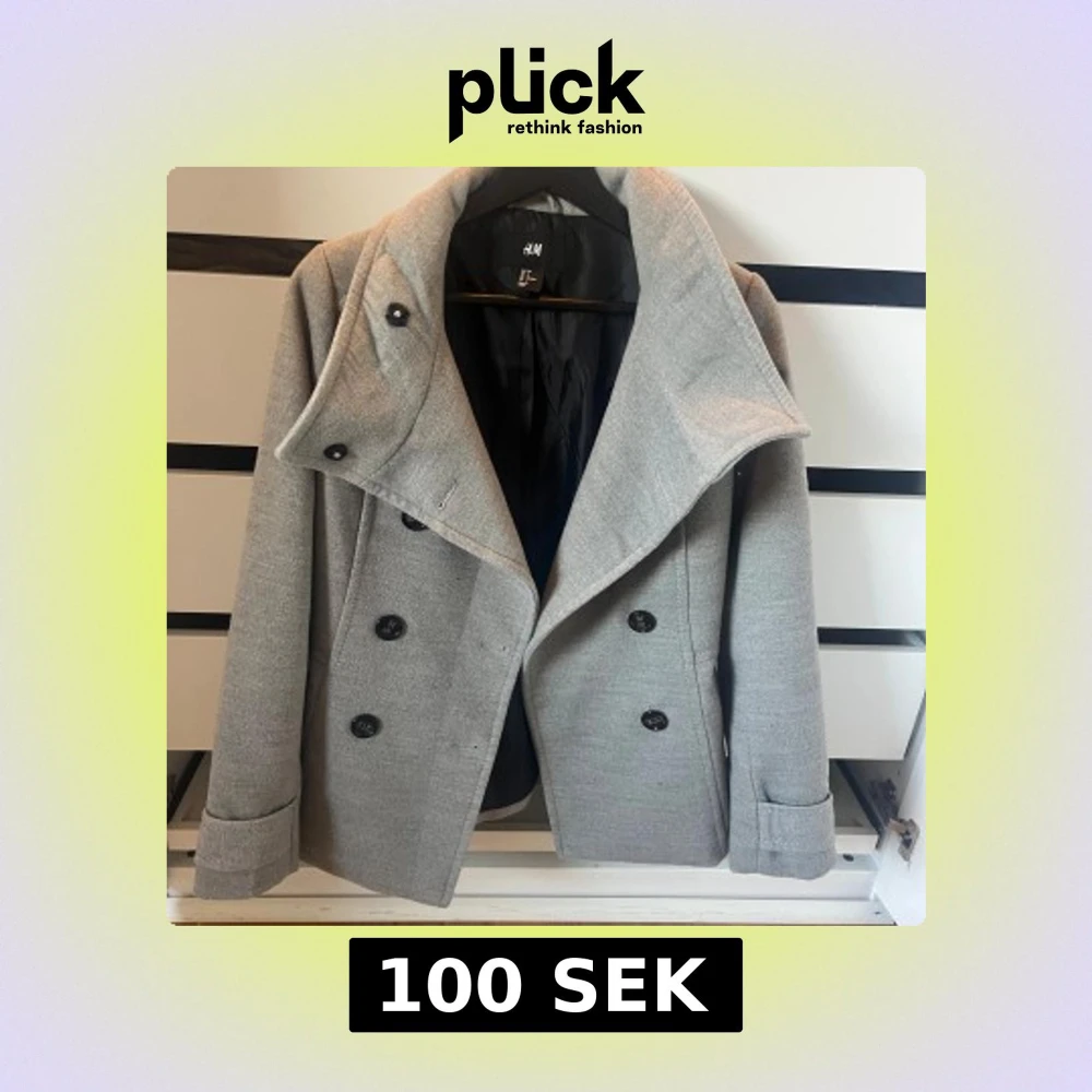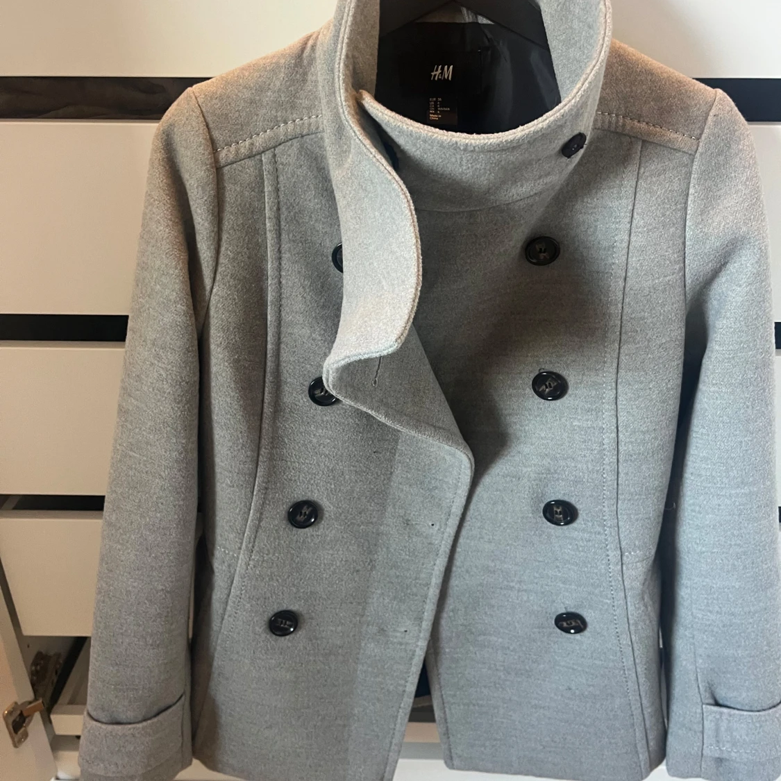 Snygg grå skepparkavaj från H&M med dubbelknäppning och bred krage. Jackan har långa ärmar och stilrena knappar framtill. Perfekt för en elegant look.