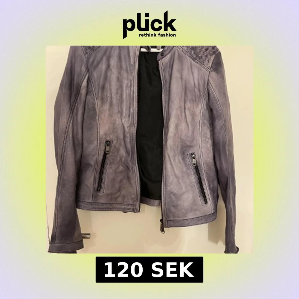 Snygg grå skinnjacka från frontrow med flätade detaljer på axlarna och dragkedjor vid fickor och ärmslut. Jackan har fläckar (se bild) som jag inte vet om dom går bort eller inte för har inte provat, men kan försöka om du är intresserad. Står ingen storlek men skulle gissa att den är xs/s.