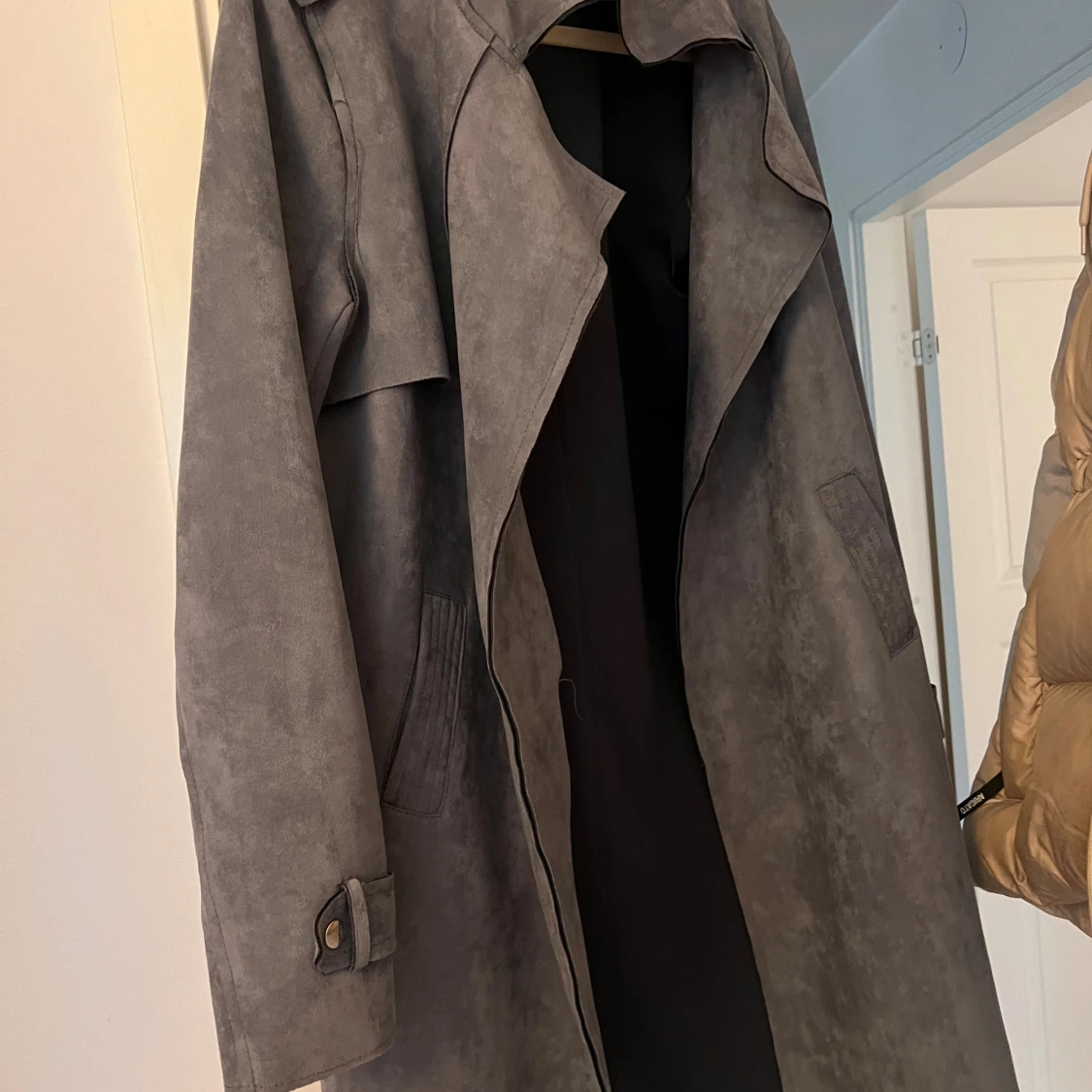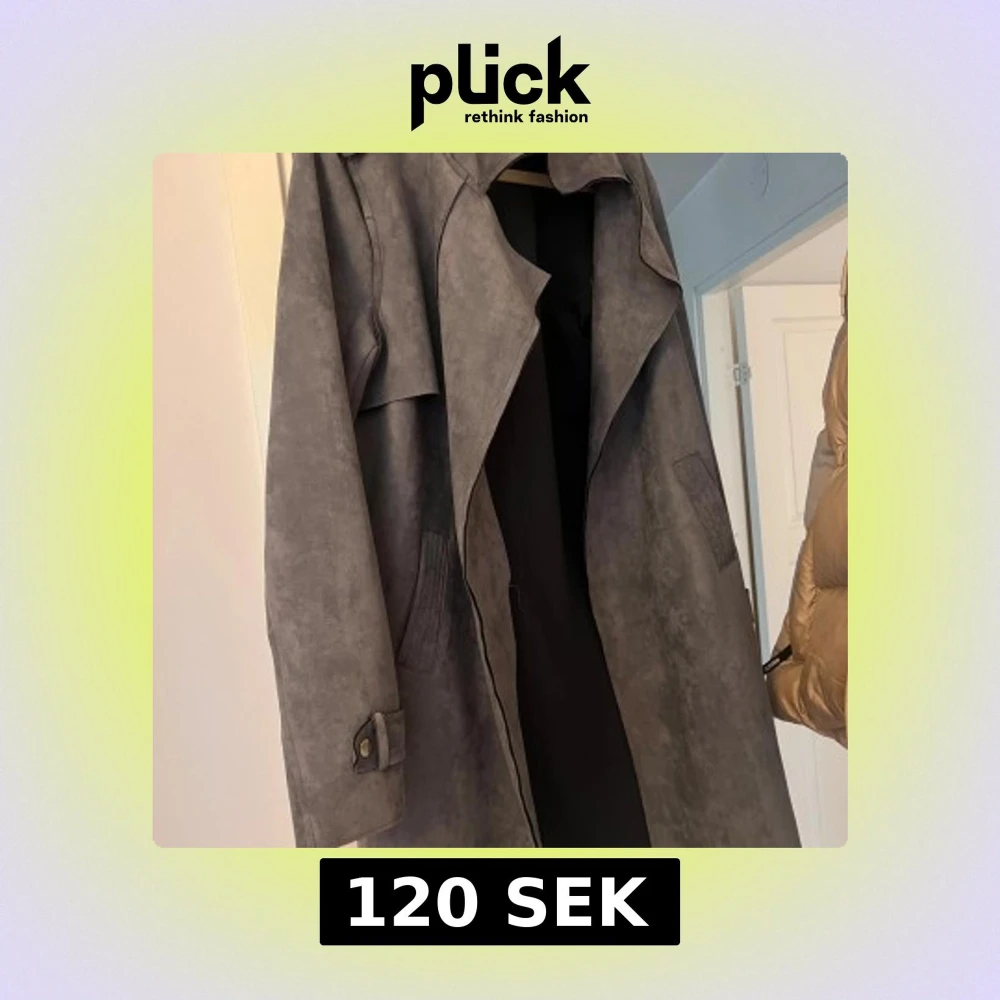 Snygg grå trenchcoat med bred krage och dekorativa detaljer vid ärmslut. Jackan har en mjuk mocka-liknande yta och två fickor framtill. Perfekt för dig som vill ha en stilren och chill vibe i höst och vår.
