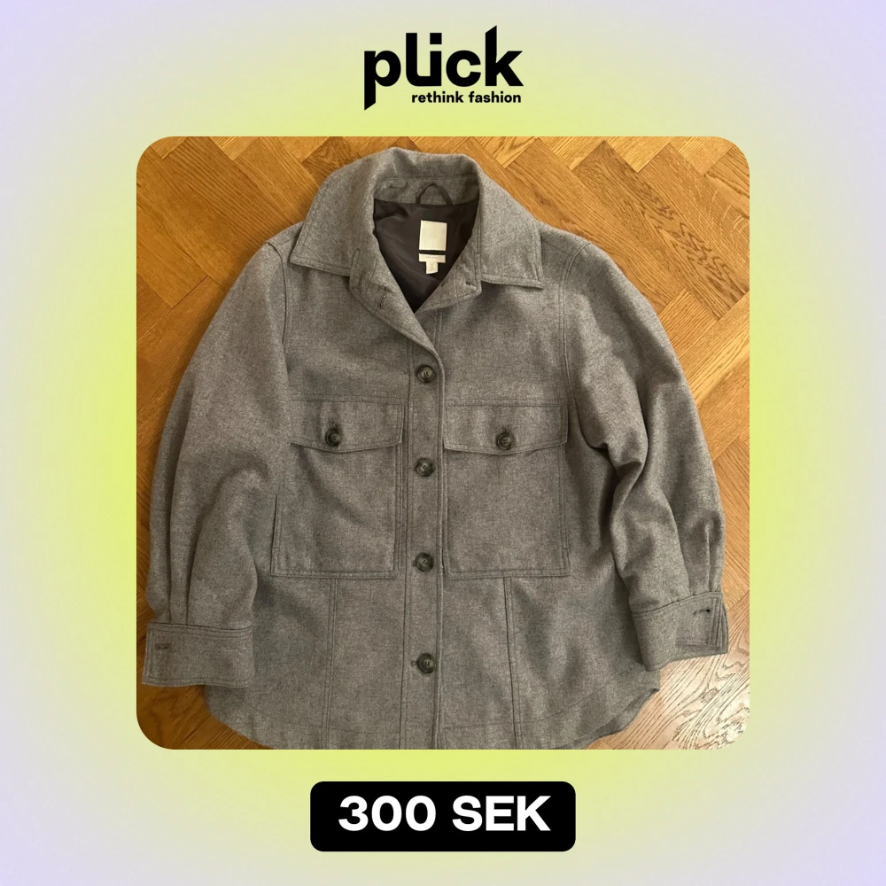 Säljer en grå ulljacka från H&M i damstorlek M. Jackan har en klassisk krage och knäppning med knappar framtill. Den har två stora bröstfickor med knappar och långa ärmar. Perfekt för höst och vår till bra pris.
