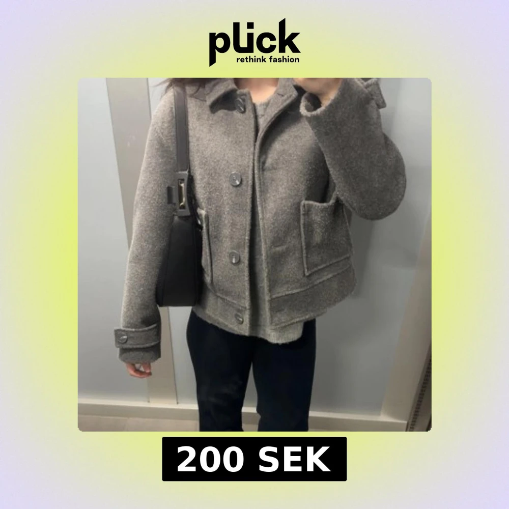 Säljer en grå ulljacka med knappar framtill och stora fickor. Jackan har långa ärmar med knappar vid ärmsluten och en klassisk krage. Perfekt för kyligare dagar men även över linne i vårsolen💗