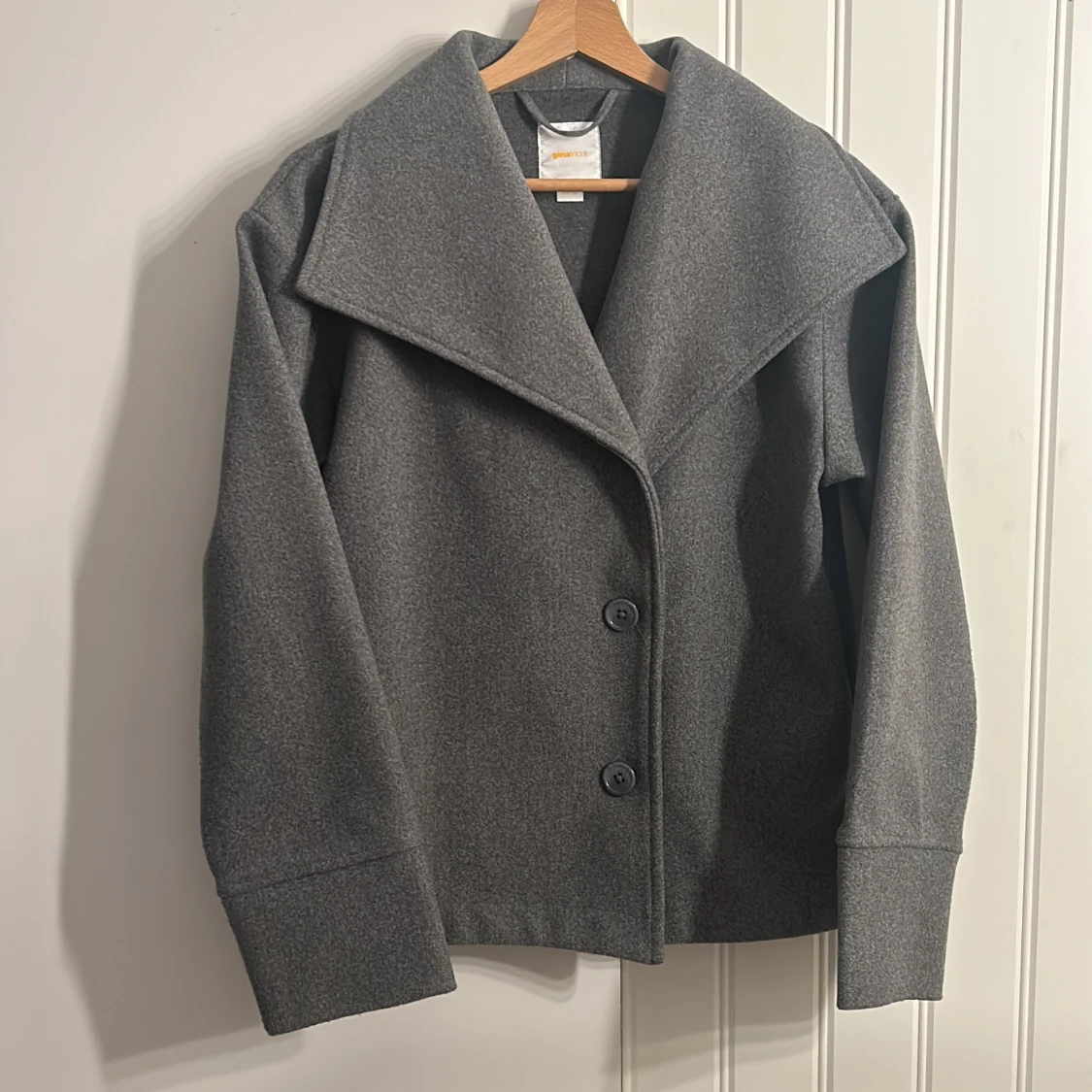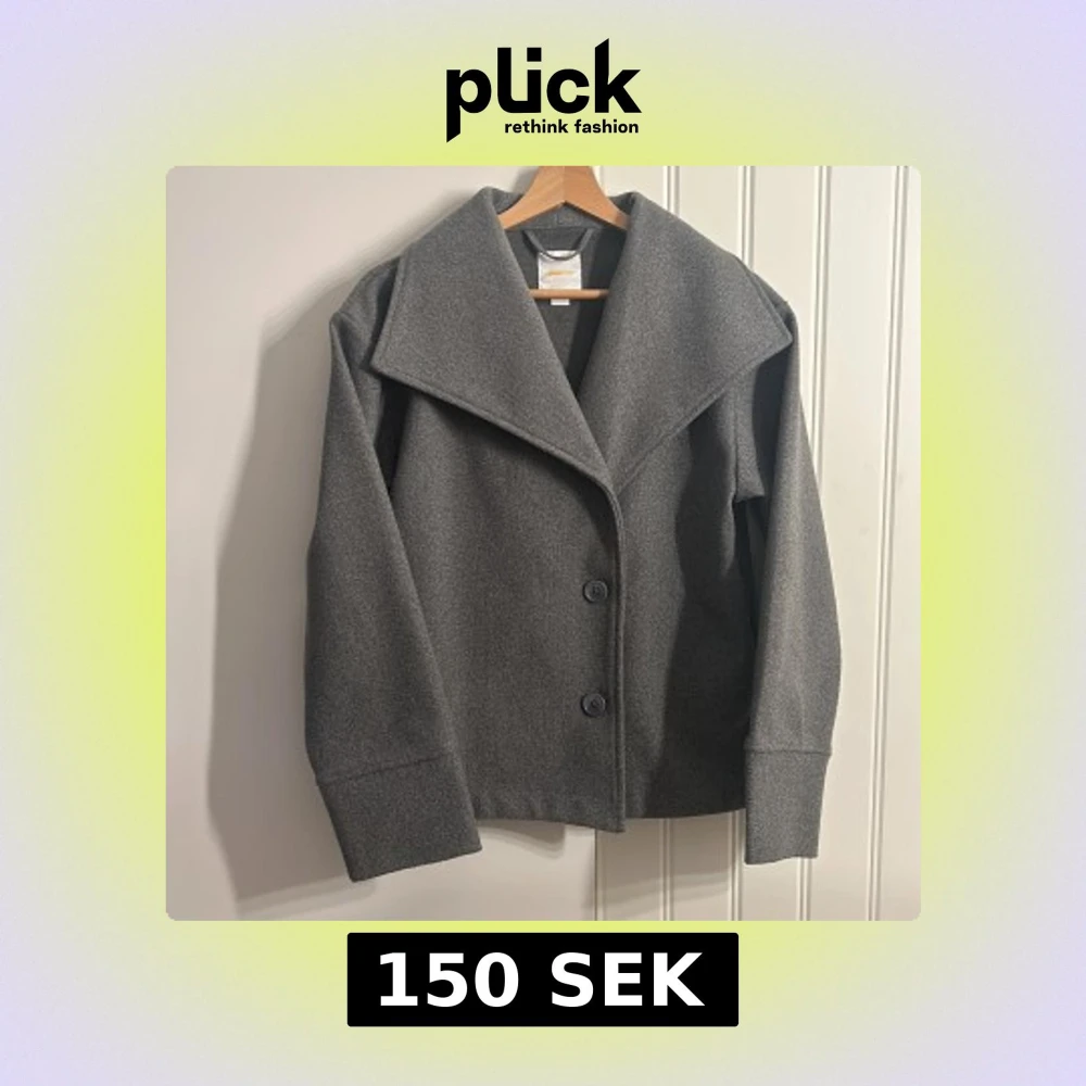 Stilren grå kappa med bred krage och två knappar framtill. Jackan har lång ärm och är tillverkad i ett mjukt ullmaterial. Perfekt för kyliga dagar och ger en klassisk look.