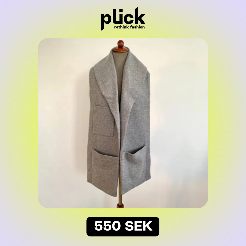 Säljer en stilren och mysig grå väst i ull. Den har en elegant design med stora fickor framtill, perfekt för att hålla händerna varma eller förvara småsaker. Västen är utan ärmar och har en bred krage som ger en extra touch av stil. Köpt för 890kr.
