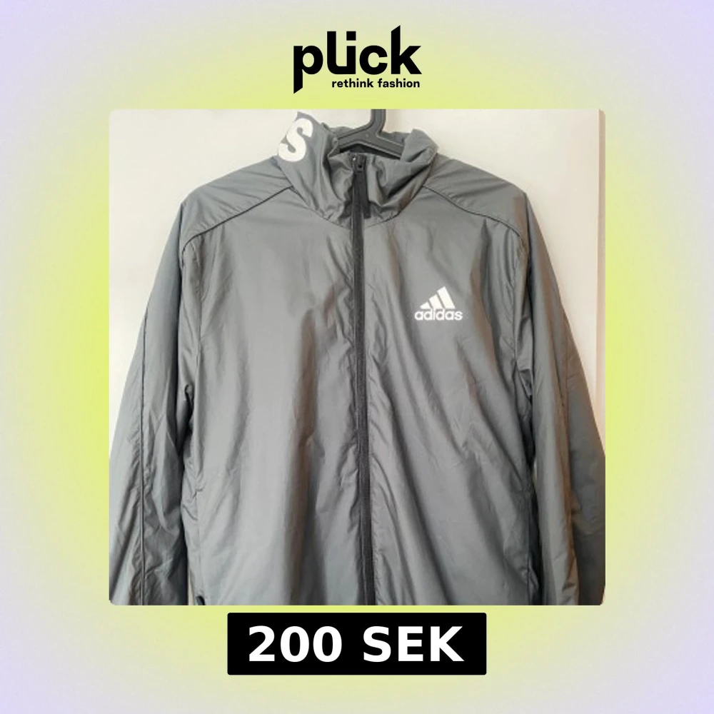 Säljer en grå vindjacka från Adidas med dragkedja och hög krage. Jackan har långa ärmar och är perfekt för blåsiga dagar.
