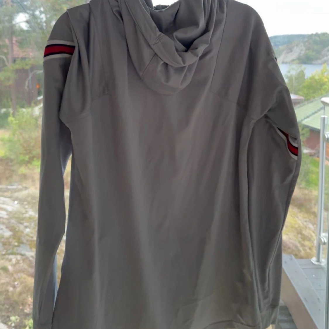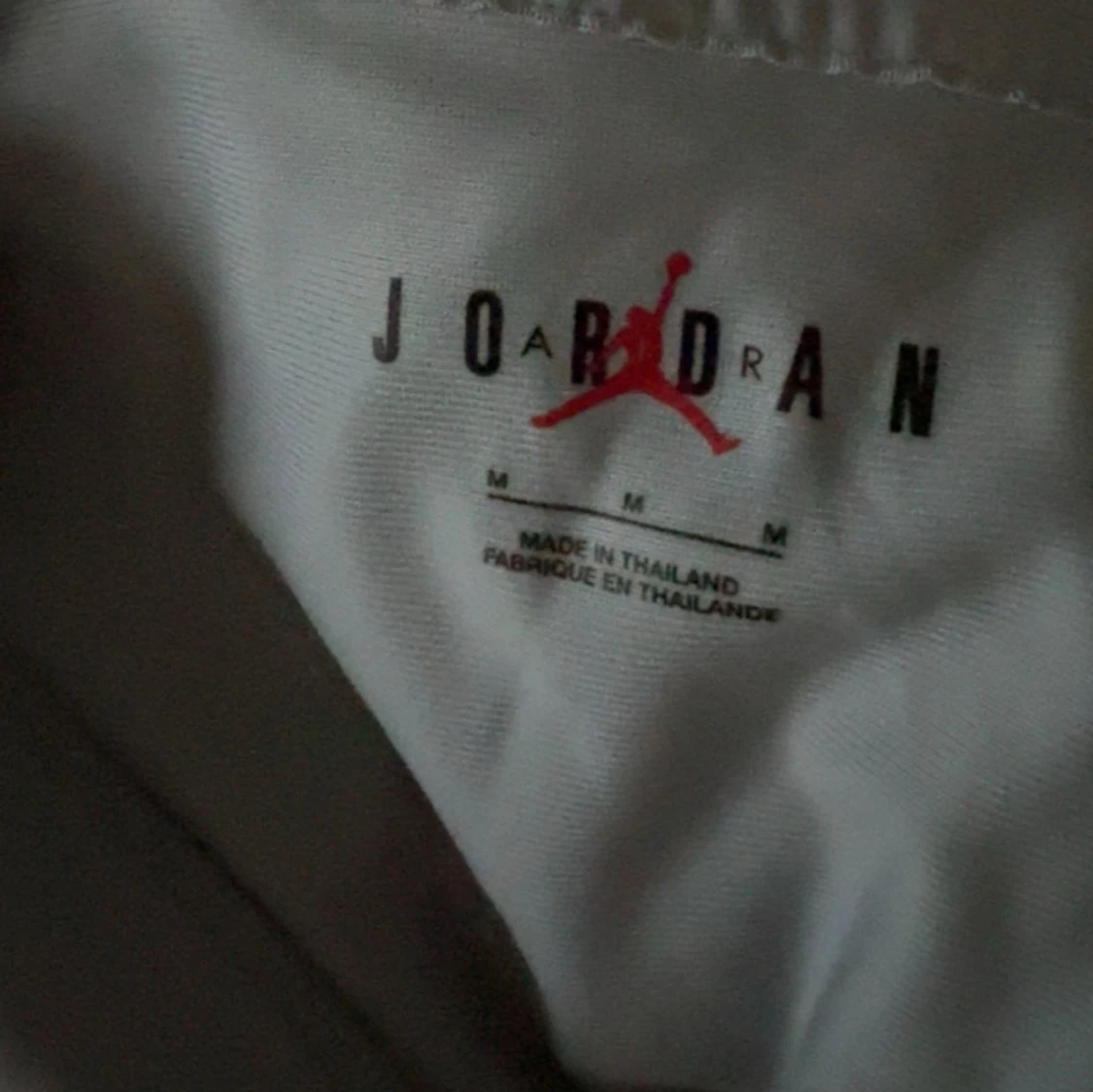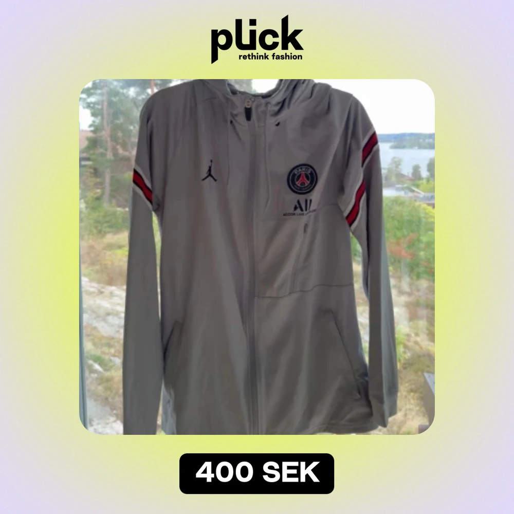 Säljer en grå vindjacka från Jordan i samarbete med Paris Saint-Germain. Jackan har en cool design med PSG-loggan och Jordan-märket på bröstet. Den har långa ärmar med röda och svarta detaljer på ärmarna. Perfekt för sportiga tillfällen eller som en stilren vardagsjacka.