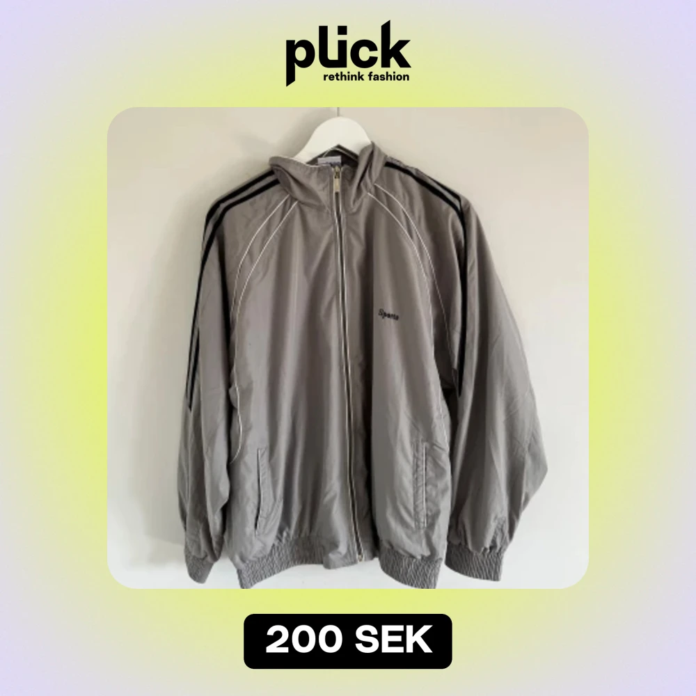 En grå supercool vintage streetwear vindjacka från SportsWear med dragkedja framtill. Jackan har långa ärmar och ribbstickade muddar vid ärmslut och nederkant. Den har också två fickor framtill och texten 'Sports' broderad på bröstet och ryggen.