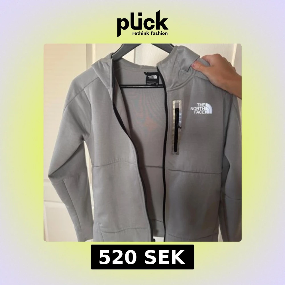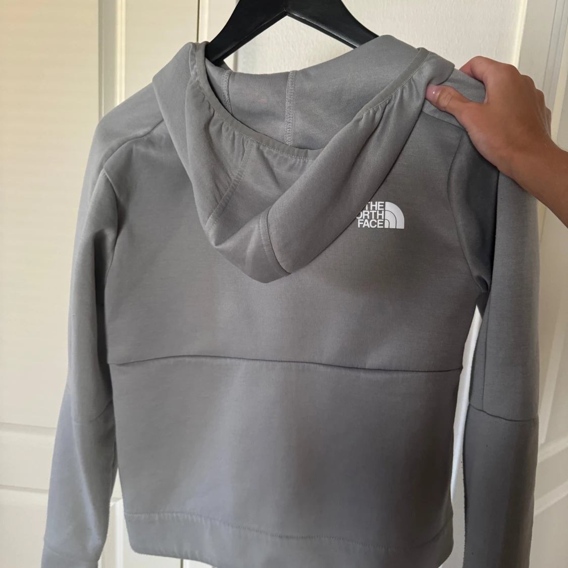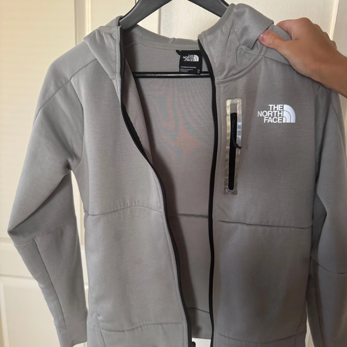 Grå dam-hoodie från The North Face med huva och dragkedja framtill. Storlek xs