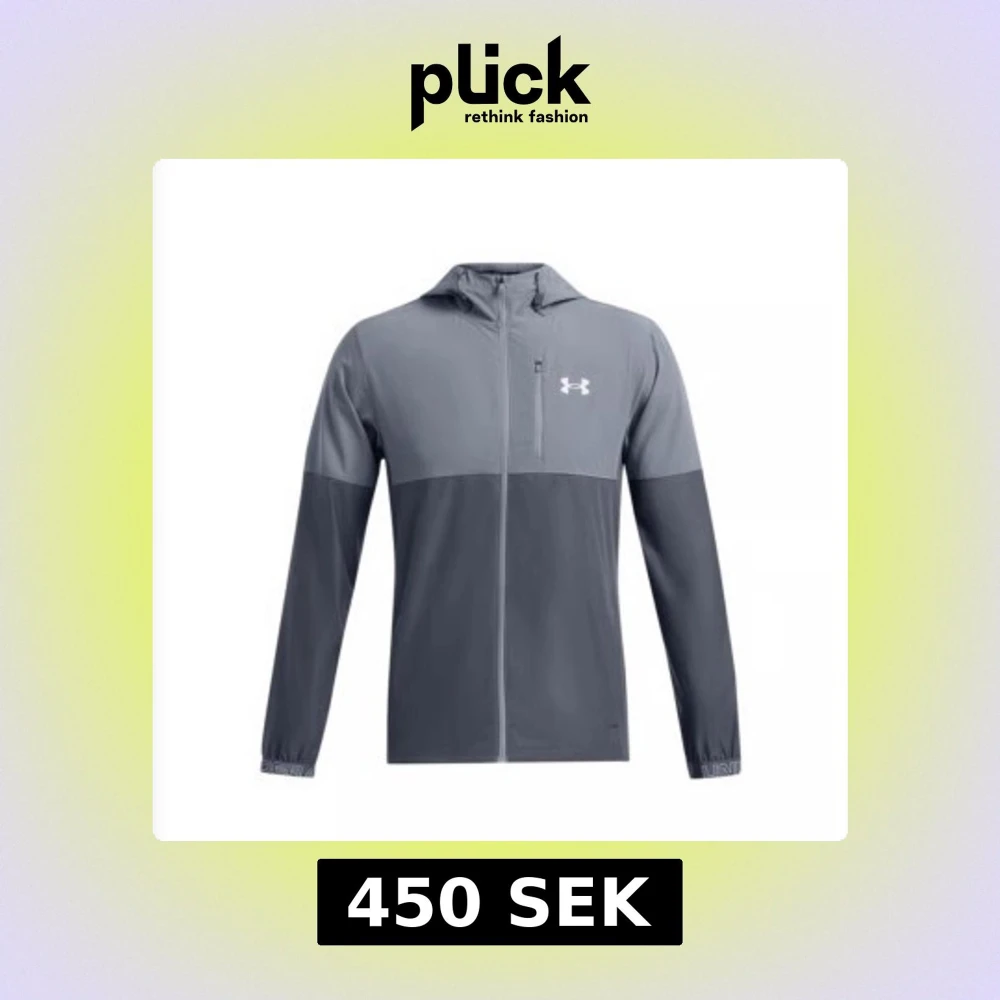 Snygg tvåtonad grå vindjacka från Under Armour med huva och hel dragkedja framtill. Jackan har lång ärm, elastiska muddar och logga på bröstet. Perfekt för träning utomhus när det blåser eller regnar lite.
