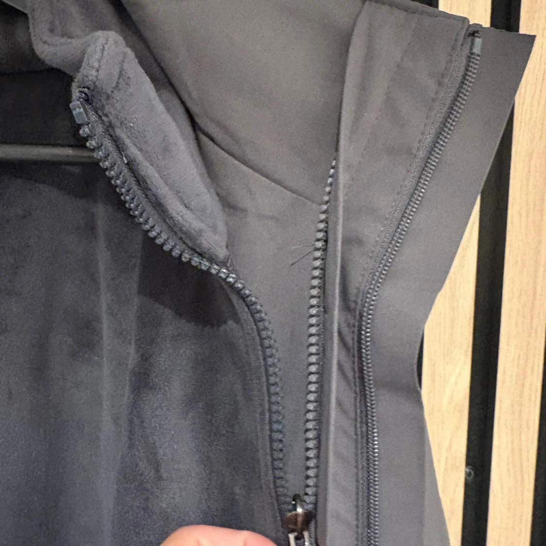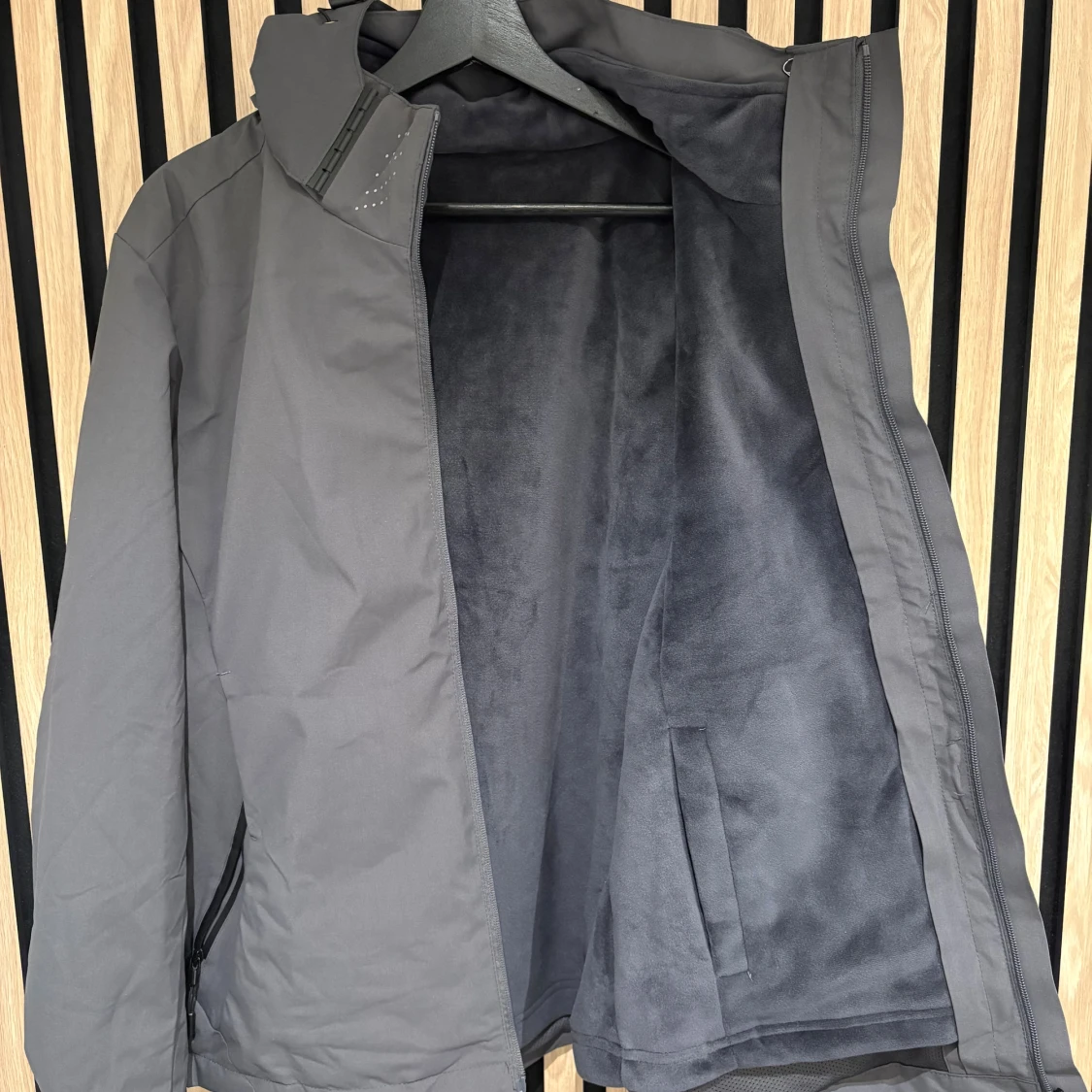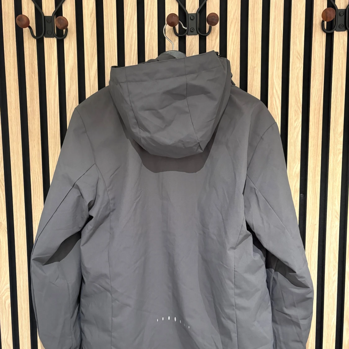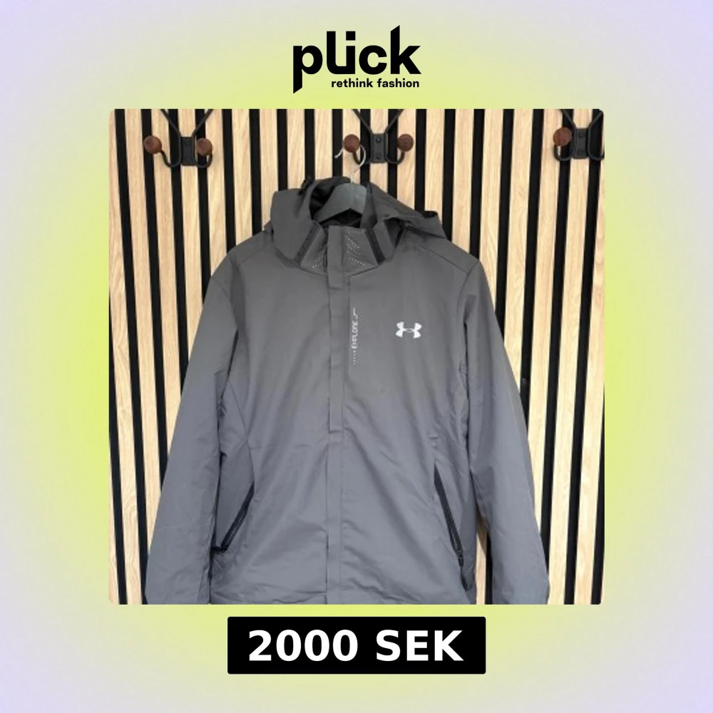 Grå vindjacka från Under Armour med huva och dragkedja. Jackan är vatten- och vindtät, har två fickor med dragkedja. Special gjort mjukt fleecefoder på insidan. Perfekt för blåsiga och regniga dagar. Snygg minimalistisk design med logga på bröstet.