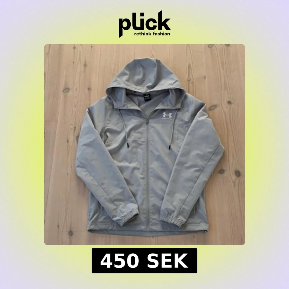Snygg grå vindjacka från Under Armour med huva och dragsko. Jackan har dragkedja framtill, elastiska muddar och meshfoder på insidan. Perfekt för dig som gillar sportig stil och vill ha något lätt och funktionellt.