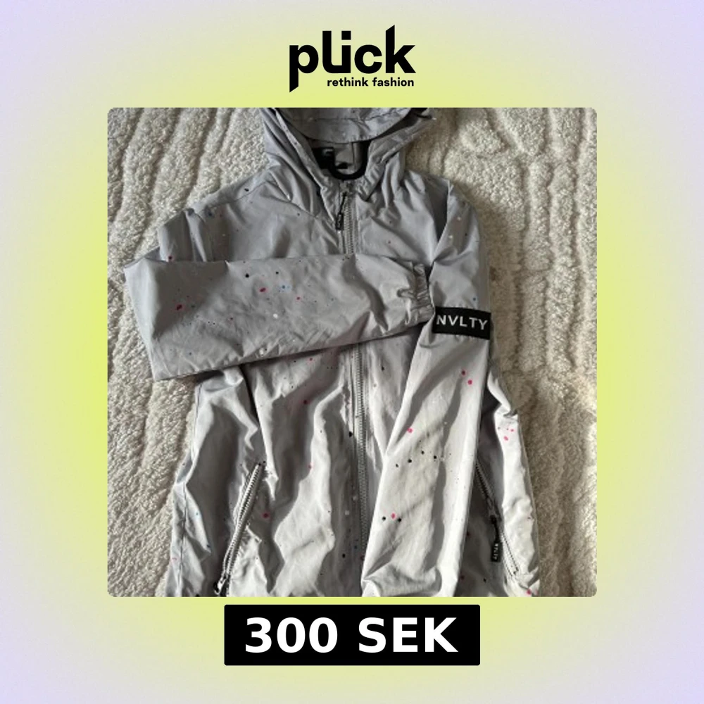 Snygg grå vindjacka från NVLTY med färgglada stänk i rosa och blått. Jackan har en praktisk huva och dragkedja framtill. Perfekt för blåsiga dagar.