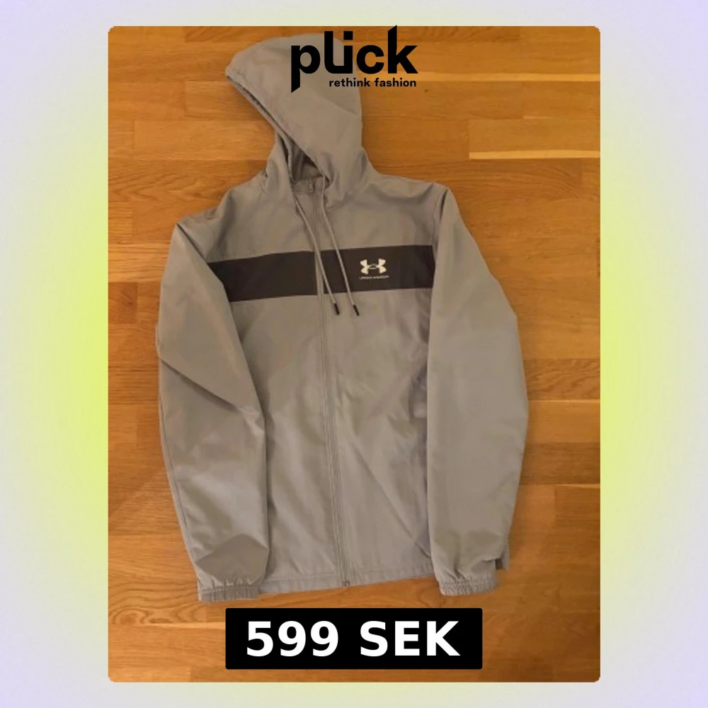Snygg grå vindjacka från Under Armour med svart panel över bröstet och vit logga. Jackan har huva med snörning, hel dragkedja och meshfoder på insidan. Perfekt för dig som gillar sportig stil och vill ha något lätt och funktionellt. Helt oanvänd!